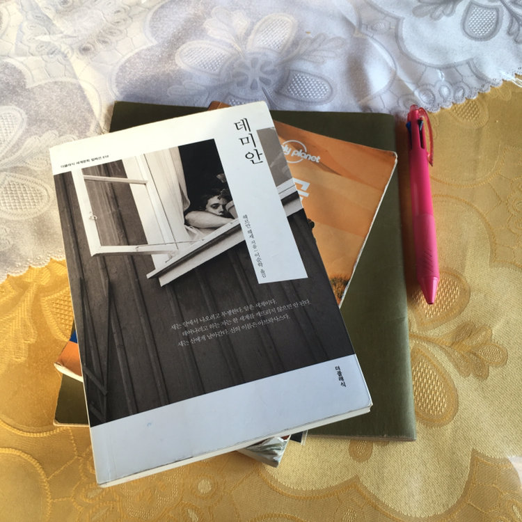 감탄스러운 경치에 흥분한 마음을 겨우 진정시키고 저녁을 먹었다. 소고기여서 또 한 번 행복했다. 저녁을 먹고 오늘의 투어 장소인 'Ongi 폐허'로 가기 전에 그림 일기장과 데미안을 꺼내 들었다. 아무래도 오늘의 명장면을 기록해두고 책을 읽고 싶었다. 여행의 순간에서 책을 읽는 행위는 일상을 들여오는 것처럼 느껴져서 좋다.