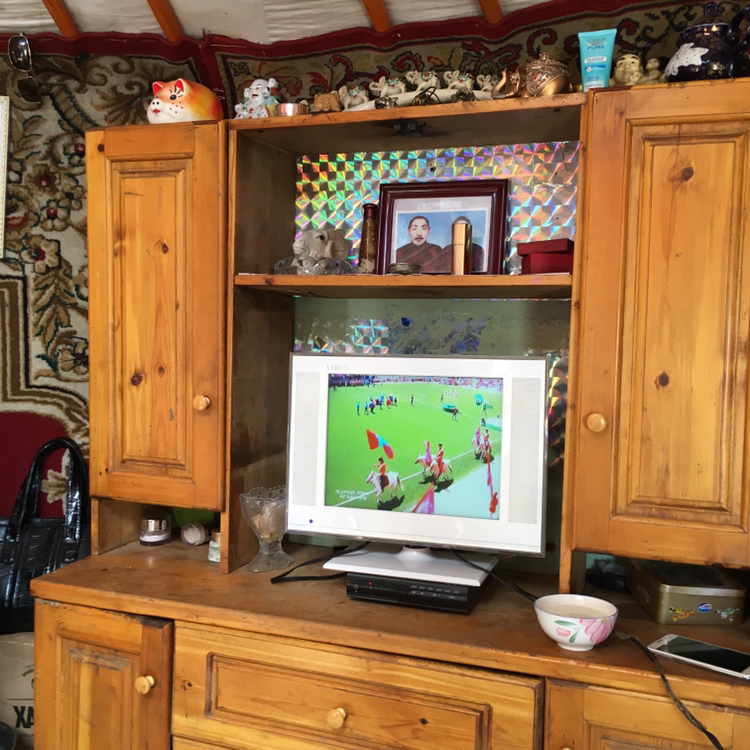 요리가 완성되길 기다리며 오늘부터 열리는 몽골의 민속 스포츠 축제인 '나담(Nadam)' 생중계를 보기 위해 TV를 켰다. 나담축제는 몽골인들에게 있어서 명절과 같이 온 가족이 모여 휴가를 즐길 수 있는 시기다. 매년 7월 11일 정도에 이틀에서 삼 일간 열린다. 우연히 나담 시기와 맞아떨어진 우리는 경기를 직접 보고 싶었지만 방송을 보니 TV로 충분하다는 생각이 들었다. 가나 아빠가 리모컨을 이리저리 돌리며 보시는 모습이 설날에 큰아빠의 모습과 똑 닮아 있었다. 서경이랑 함께 찍은 사진은 내가 가장 좋아하는 사진 중 하나인데, 저것 역시 명절에 찍은 가족사진같이 너무 보기 좋다. (그냥 아빠랑 딸 아니냐.)
