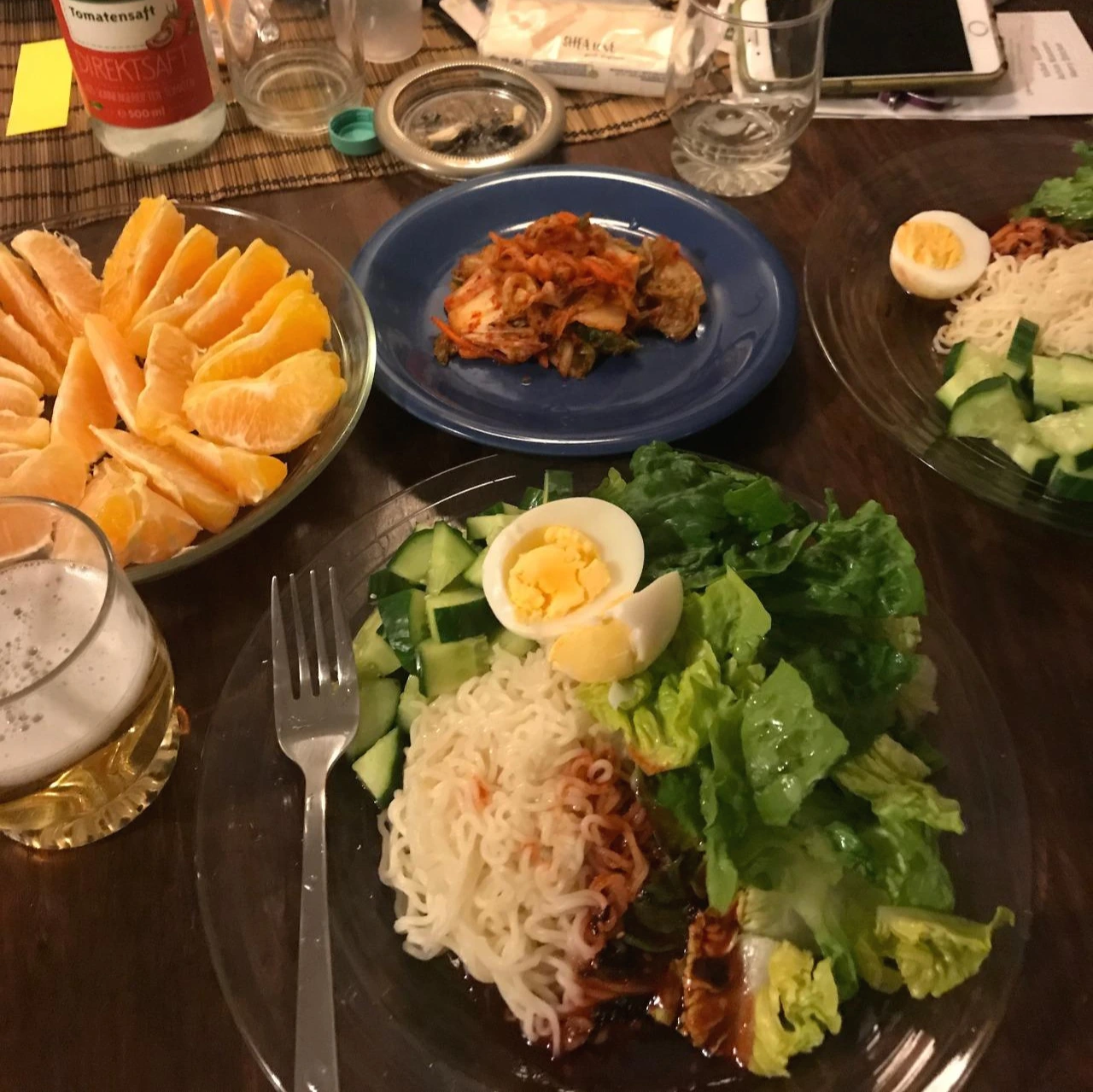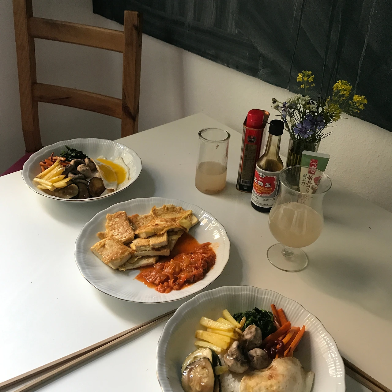 그런데 베를린에서는 만나는 사람 중 절반 이상이 채식주의자였다. 그럴 때 가장 완벽한 한식은 바로 비빔밥이다. 구운 채소만으로도 충분히 훌륭한 맛을 낼 수 있고, 무엇보다 평소 자신이 좋아하는 채소를 골라서 넣으면 된다. 간단히 먹고 싶을 때는 비빔면을 만들기도 했다. 시중에 판매하는 비빔면에 상추를 넣고, 삶은 계란을 함께 곁들이면 꽤나 그럴싸한 요리가 된다. 비빔밥이나 비빔면을 본 외국인 친구들은 하나같이 형형색색의 비주얼에 감탄했다. 예쁘게 쌓아둔 재료를 젓가락으로 슥슥 비비기에는 아깝다며 망설이기도 했다.