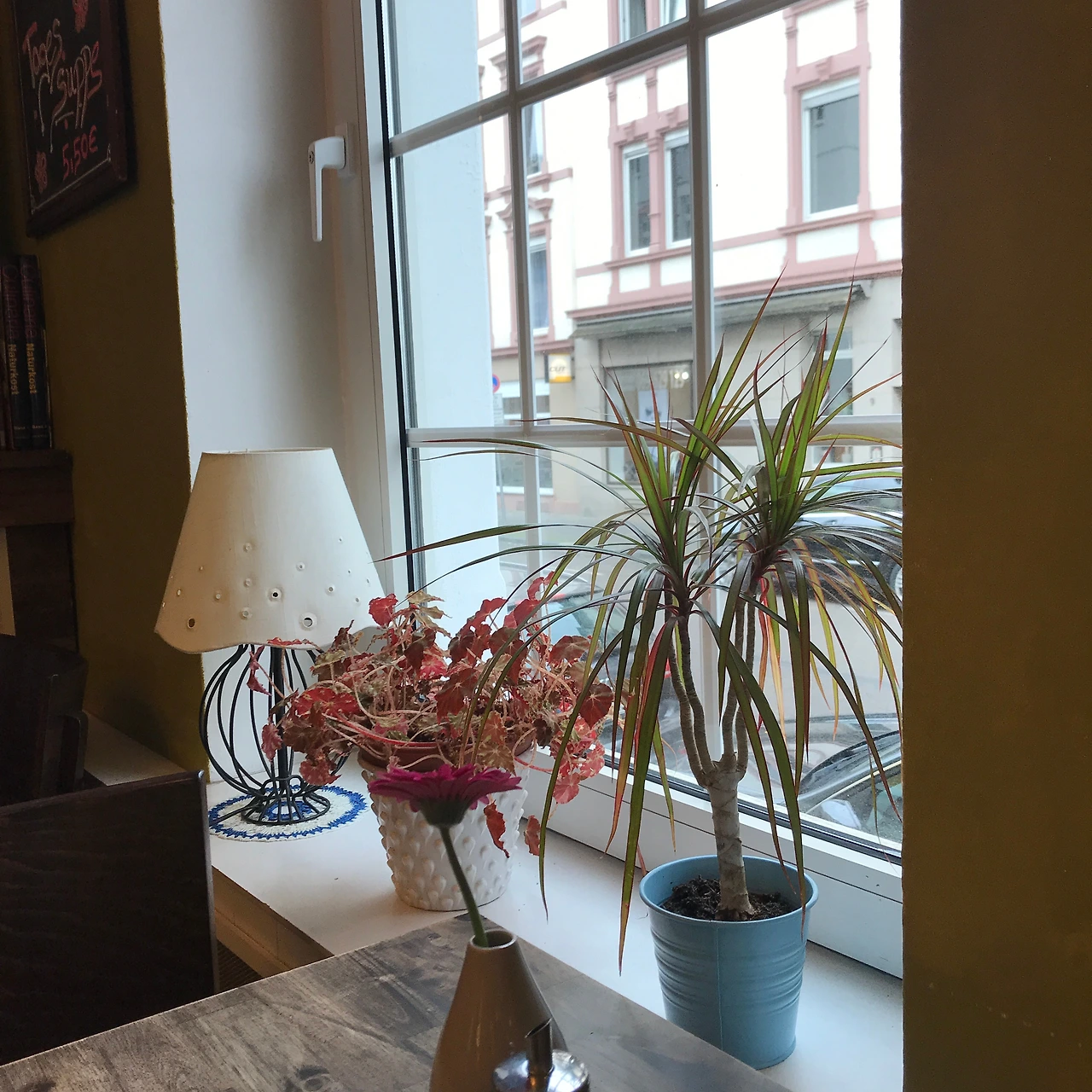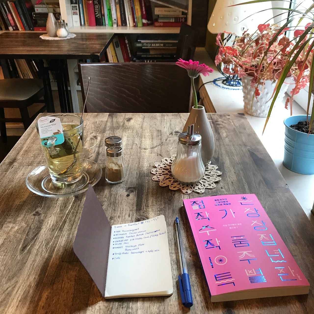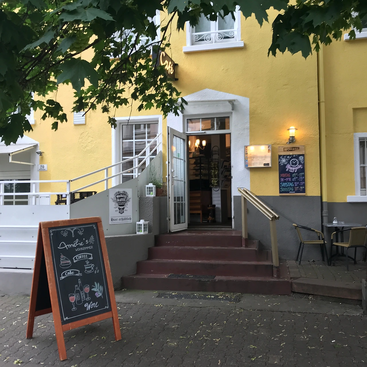 나의 하루는 대부분 그날의 기분에 따라 정해지곤 했다. 앉아서 멍 때리고 싶으면 마트에서 간단히 요기할 음식을 사들고 그뤼네부르크(Grüneburgpark)에 가거나, 걷고 싶으면 마인 강가를 정처 없이 배회했다. 프랑크푸르트에서는 꼭 해야겠다고 마음먹었던 것이 없었기 때문에 그때그때 하고 싶은 것을 곧장 실천했다. 그저 마음에 여유를 가지고 흘러가는 시간을 오롯이 느끼고자 했다. 카페 아멜리에도 버스를 타고 지나가다가 갑자기 내리고 싶은 동네에서 우연히 발견하게 된 장소다. 늘상 어떤 장소를 발견할 때면, 보통 첫인상이 두 갈래로 나뉜다. 주변 환경과 조화롭게 어우러졌다던가 혹은 혼자만 동떨어져 돋보인다던가. 아멜리에는 아무래도 전자에 가까웠다. 고급진 주택이 즐비한 골목길에 햇노란색의 예쁜 카페라니. 보자마자 탄성이 나왔고, 곧바로 들어가 보고 싶은 욕구가 일렁였다. 곳곳에 보이는 아기자기한 글씨와 그림체가 마치 이곳엔 꽃자수가 놓인 앞치마를 맨 푸근한 인상의 아주머니가 케이크를 굽고 있을 것만 같았다. 소녀의 미소를 지닌 주인아주머니와 인사를 할 마음의 준비를 하며 안으로 들어서자, 웬걸. 아주 단정한 대머리 아저씨가 딱딱한 독일어로 인사를 건넨다. 웃지는 않았지만 꽤나 친절한 인상이었다.(고 믿고 싶다.) 시선을 빼앗는 디저트가 아주 많았지만, 왠지 다음번에 친구와 다시 와서 제대로 먹고 싶은 마음에 음료만 시켰다. 카페인이 들어가지 않은 차를 고르다 보니, 나의 선택은 모로칸 민트 티. 주문을 마치고 내부를 천천히 둘러보는데 말 그대로 'Cozy' 그 자체였다. 아멜리에라는 이름과 카페 분위기가 어쩜 이렇게 잘 어울리는지. 오후의 햇살을 한껏 머금은 듯한 밝은 톤의 벽지와 형형색색의 꽃이 산뜻한 분위기를 자아냈다. 이때 보현이에게 잔뜩 흥분한 채로 아주 괜찮은 카페를 발견했다며 실시간 사진과 함께 메시지를 보냈다. 혼자 있을 때는 궁상을 떠는 편이라 보현이랑 오면 디저트를 잔뜩 시켜야지. 하고 생각했는데 결국은 이게 처음이자 마지막이 되었다. 재방문을 하리라 다짐했으나, 새로운 시도를 즐겨하는 탐험자에겐 쉽지 않은 일이었다.