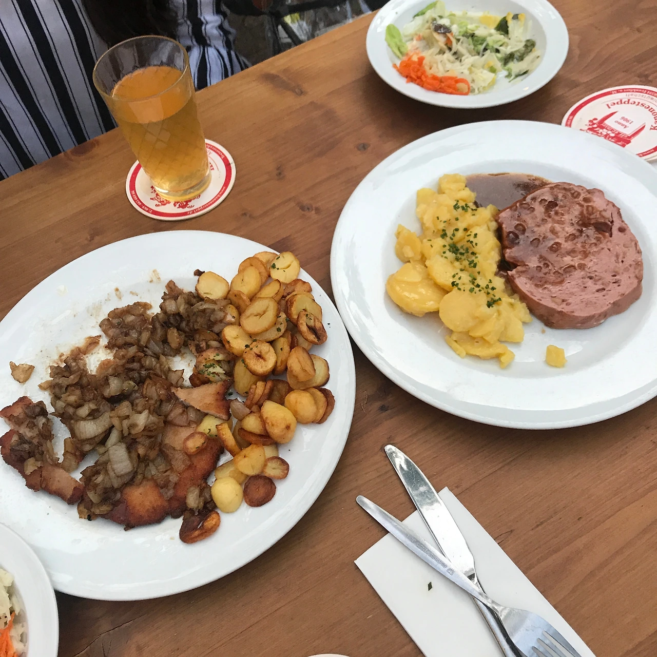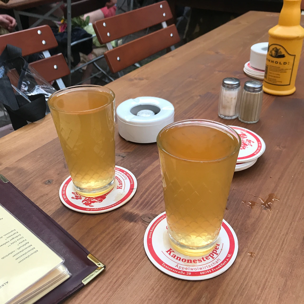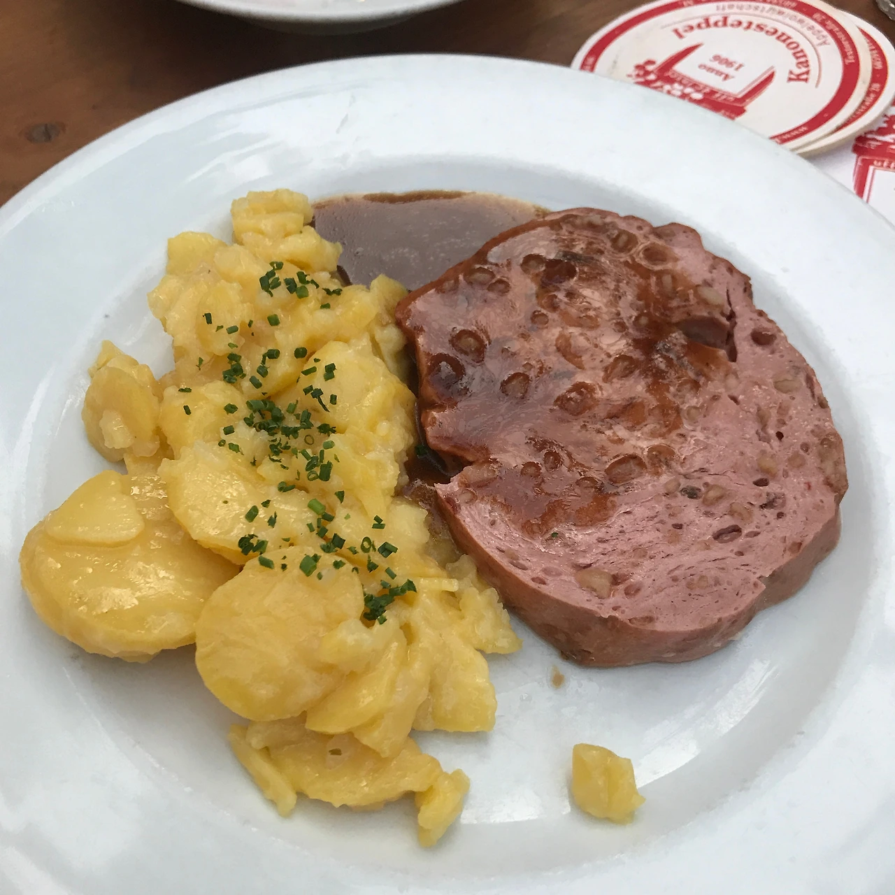 보현이의 숙소에 도착하자마자 아이젤너 다리, 뢰머 광장을 비롯한 몇몇 랜드마크를 찍으며 바지런히 돌아다녔다. 이상하게도 시차에 곧바로 적응해 종일 쌩쌩했다. 저녁에는 보현이가 마법 같은 요리 솜씨를 한껏 발휘한 삼겹살 만찬을 맛보았고, 이때 와인을 몇 잔 곁들였더니 결국 씻지도 못하고 곯아떨어졌다. 다음날 보현이는 독일식 저녁을 먹자고 제안했다. 나 역시도 현지 음식을 먹어보고 싶었던 터라, 아침부터 열심히 찾아보았다. 여러 레스토랑 중에 우리의 선택은 구글 지도에서 평이 아주 후했던 카노네슈테펠(Kanonesteppel). 난쟁이 집에나 걸려있을 것 같은 독특한 간판을 보고 내부로 들어서자 놀라운 광경이 펼쳐졌다. 독일 전통 건축양식을 따른 길쭉한 집의 앞마당에 가든 형식의 테이블이 불규칙적으로 놓여 있었다. 분명 건물 안인데 바깥에서 식사를 하는 기분이라고 할까나. 더군다나 사람들의 시끌벅적한 대화 소리로 음악이 따로 필요 없었다. 불특정 다수의 독일어가 여느 음악보다 유쾌한 노랫소리 같았으니. 우리는 슈니첼과 소시지 그리고 사과를 발효시킨 술 '아펠바인' 시켰다. 잘 튀겨진 돈가스 같은 슈니첼과 짭조름한 소시지, 상큼한 사과와인의 조합은 가히 최고였다. 기본으로 나오는 샐러드도 훌륭했다. 무엇보다 양이 넉넉해서 맥주를 많이 마시고 싶다면 둘이서 하나를 시켜도 충분할 것 같다. 우리는 이미 배불렀지만 너무나 좋았던 분위기에 취해 맥주를 한잔씩 더 시켰고, 마감시간까지 수다를 떨었다.
