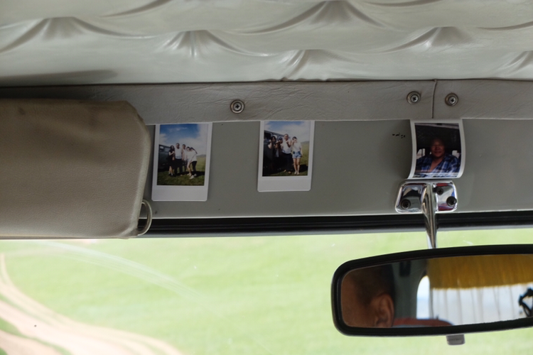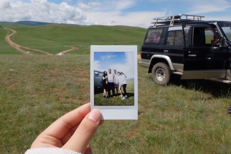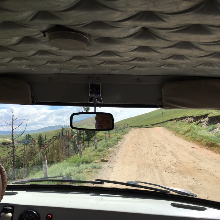내일은 울란바타르로 돌아가는 일정밖에 없으니 오늘이 사실상 투어 마지막 날이라고 해도 무방했다. 그래서 오늘도 차가 멈출 때마다 무조건 내려서 바깥 경치를 즐기기로. 이동 중에도 절대 잠들지 않고 창 밖의 풍경을 두 눈으로 꼬옥 붙잡아 두려고 했다. 마침 날씨도 따라 주었다. 눈부시게 찬란한 날씨여! 이번엔 가나, 디마, 에르카와 단체사진도 찍었다. 마지막이 될 수도 있다는 생각에. 그리곤 그들에게 그 사진을 선물했더니, 차에 저렇게 꽂아두었다. 평생 이 푸르공의 장식으로 있었으면!