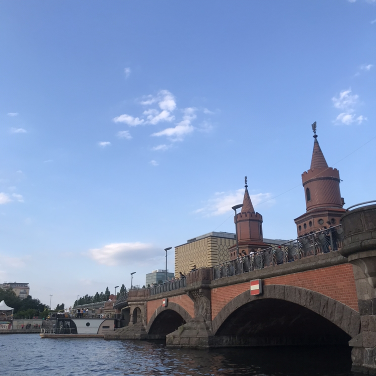 베를린은 베네치아보다 많은 다리가 있다고 한다. 다양한 시대에 지어진 거의 천 개의 다리가 있는데 그중 프리드리히스하인 구와 크로이츠베르크 구를 서로 연결하는 오버바움 다리는 가장 많은 시간과 비용이 들어갔다고 한다. 과연 노고가 고스란히 느껴지는 건축적 요소가 돋보인다. 붉은 벽돌로 지어진 뾰족한 두 개의 성탑이 인상적이다. 다리 위로는 자동차뿐만 아니라 지하철 1호선이 운행되어 계속해서 지나가는 노란 전철을 볼 수 있다. 파란 여름의 하늘과 노란색 전철이 교차하는 모습은 영롱한 아름다움을 자아낸다. 드넓게 펼쳐진 슈프레 강의 경치는 이 다리가 주는 덤!