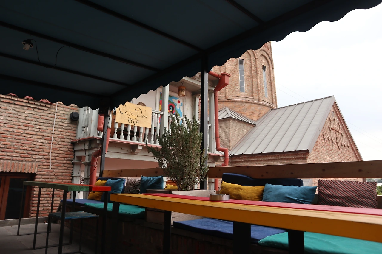 아르헨티나에서 온 두 청년이 내게 남긴 메시지는 트빌리시의 한 변두리 카페에까지 닿게 했다. 원래 다른 루프탑 카페를 찾아가는 길이었지만, 그냥 지나칠 수 없게 만드는 외관에 발길을 멈췄다. 근방으로는 연갈색의 심심한 건물 밖에 없었는데 별안간 파스텔톤으로 가득한 카페가 나타나다니? 홀로 타들어가는 촛불처럼, 유난히 생생하게 빛나는 곳이었다. 좁은 문틈 사이로 흘러나오는 노래와 나른한 향기에 곧장 매료되고 말았다. 더군다나 카페 이름이 카르페 디엠이다. 가게의 현판을 보자마자 이건 운명이다 싶어 자리에 앉아 커피를 주문했다. 메뉴판을 살펴보니 커피뿐 아니라, 각종 술과 간단한 음식도 팔고 있었다. 나의 선택은 아이스 아메리카노. 다행히 조지아 사람들도 아이스커피를 즐겨 먹나 보다. 가파른 언덕길에 위치해 있는 이 카페를 일몰 무렵에 찾아온다면, 교회의 십자가 뒤로 해가 내려앉는 풍경을 볼 수 있다. 우연히 초저녁 시간에 머물렀던 나는 성 삼위일체 대성당(Holy trinity cathedral)의 꼭대기가 붉게 물드는 풍경을 보았다.