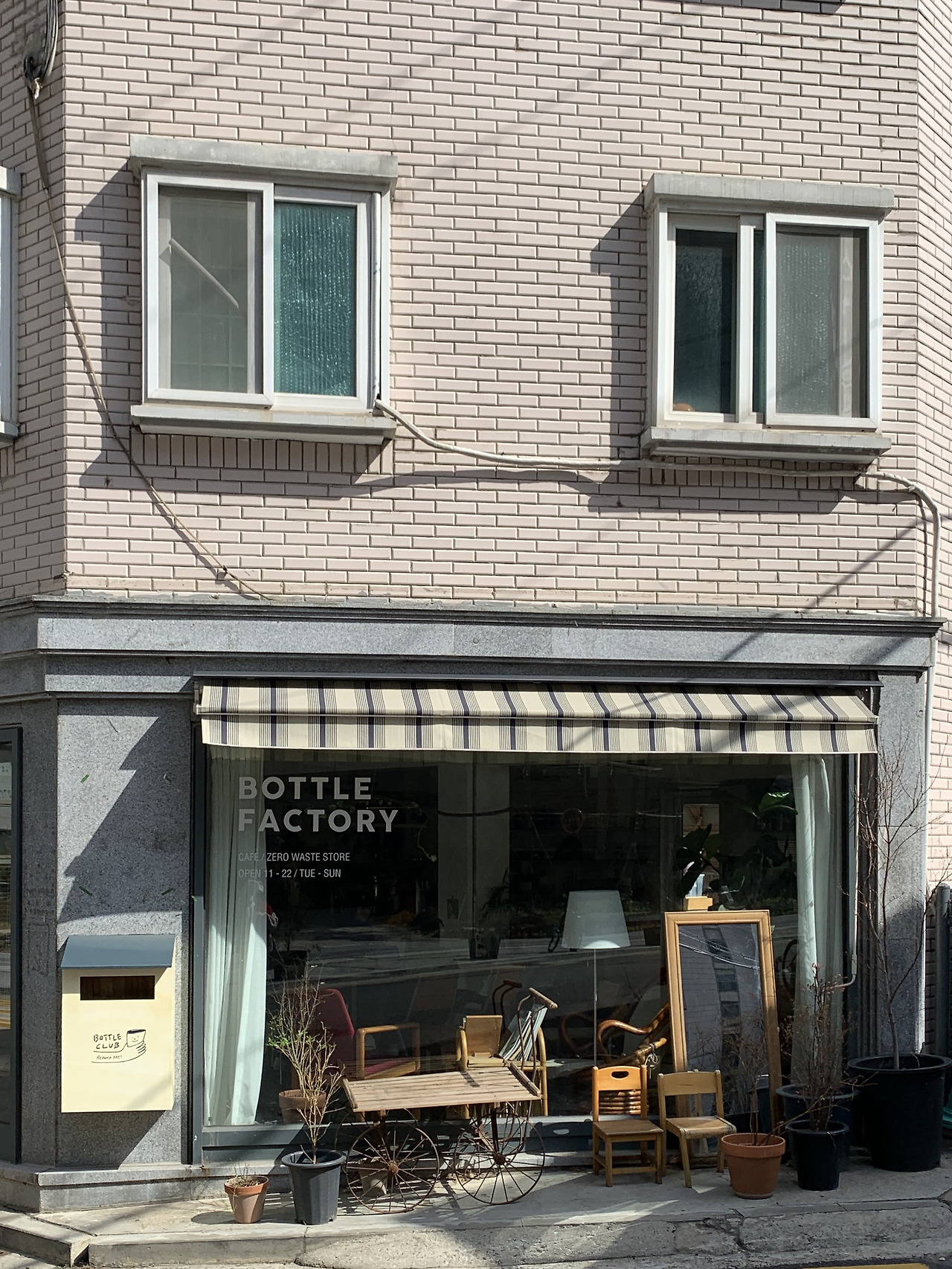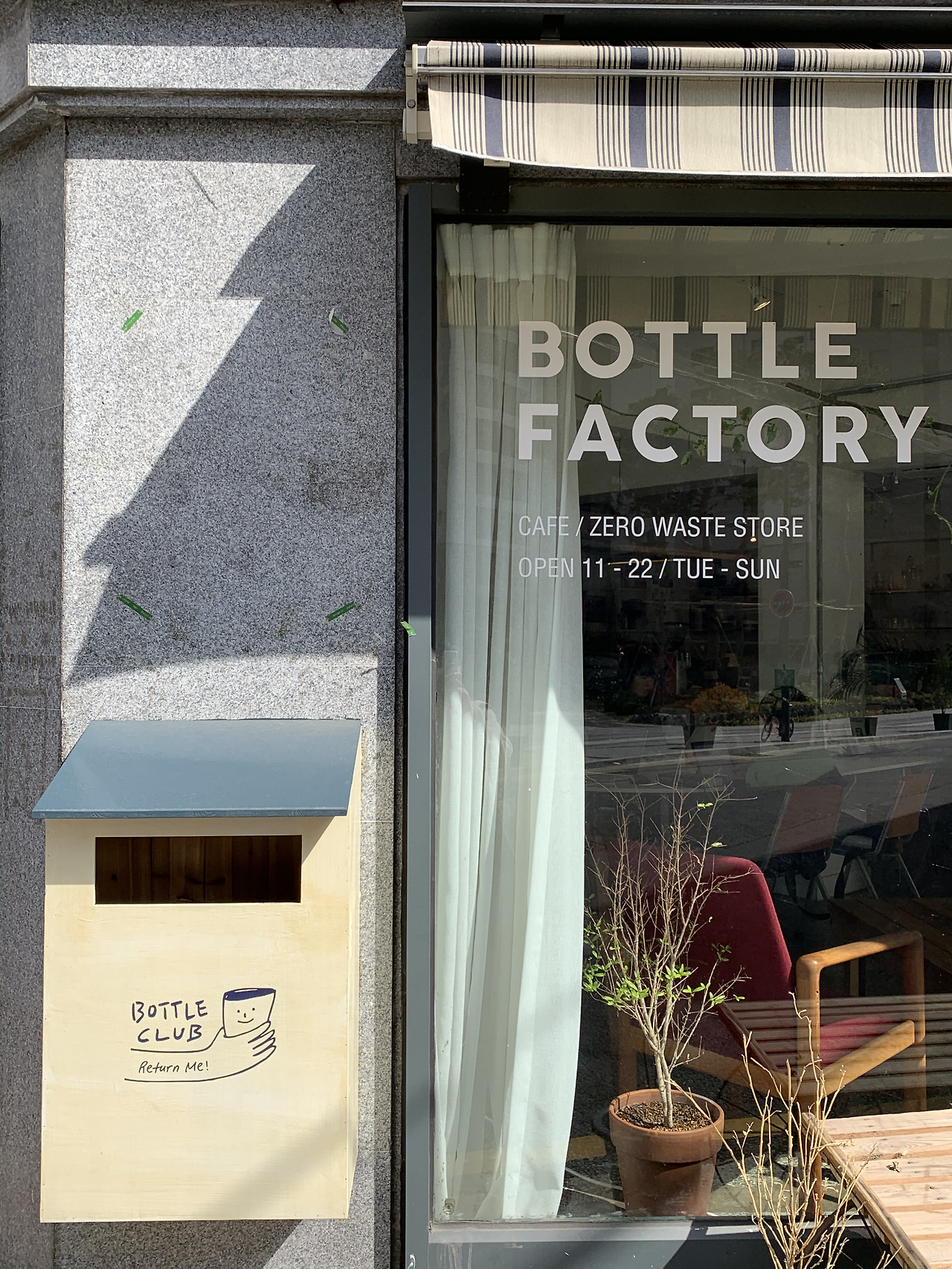작은 실천부터 시작하기 위해서 택한 방식은 ‘제로 웨이스트(Zero Waste: 쓰레기 생산을 최소화하는 생활 습관)’이다. 사실 지난날의 나를 새롭게 바꾼다는 것은 결코 쉽지 않은 여정이 될 것이나, 변화를 더 할수록 오히려 불필요한 행동과 소비를 덜어내게 된다. 결국 단순한 삶에 더욱 가까워진다고 믿는다. 건강한 생활과 소비를 지향하고자 하는 나에게, 늘 좋은 에너지를 주는 이웃이 있다. 바로 홍제천 변에 위치한 카페 보틀팩토리(Bottle Factory)이다. 보틀팩토리는 기본적으로 ‘일회용품을 쓰지 않는 카페’인데, 이들이 행하는 여러 활동은 가히 획기적이고, 놀라웠다.
