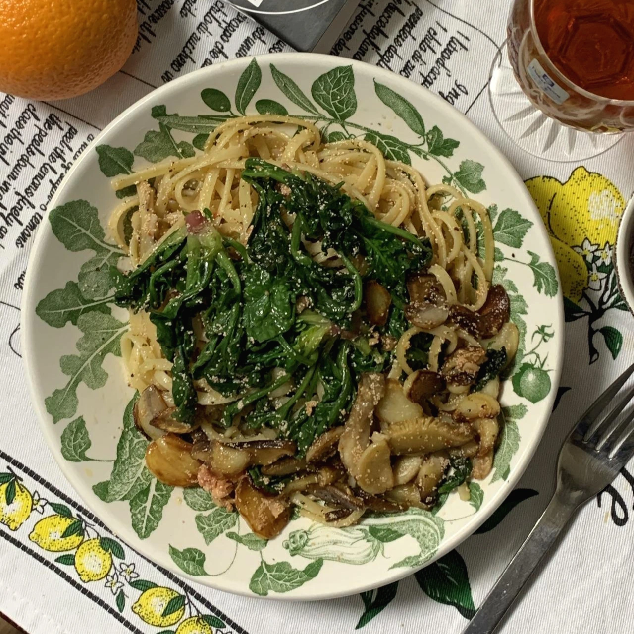 파스타면, 올리브 오일, 마늘, 시금치, 명란, 오레가노, 소금, 후추