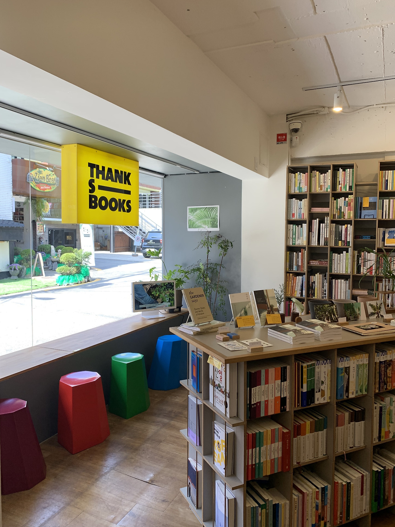 이번에는 우리에게 작고 아름다운 식물원을 안겨준다. 마치 봄이 선사하는 포근함처럼, 서점에 들어서는 순간 푸릇하고 따스한 기운이 전해졌다. 땡스북스의 책 큐레이션은 남다른 일관성을 보인다. 초창기부터 현재까지 '디자인과 콘텐츠가 잘 어우러지는 책'을 소개하겠다는 철학이 견고하게 자리 잡았다. 이곳의 최대 장점은 겉뿐만 아니라 속도 훌륭한 책들이 한눈에 보기 쉽게 배열되어 있다는 것이다. 그래서 사실 내게 땡스북스는 '누군가에게 선물할 책을 고르기 딱 좋은 서점'이다. 주제별, 작가별, 출판사별로 일목요연하게 정리된 책장이 곧 든든한 도우미가 되어준다.
