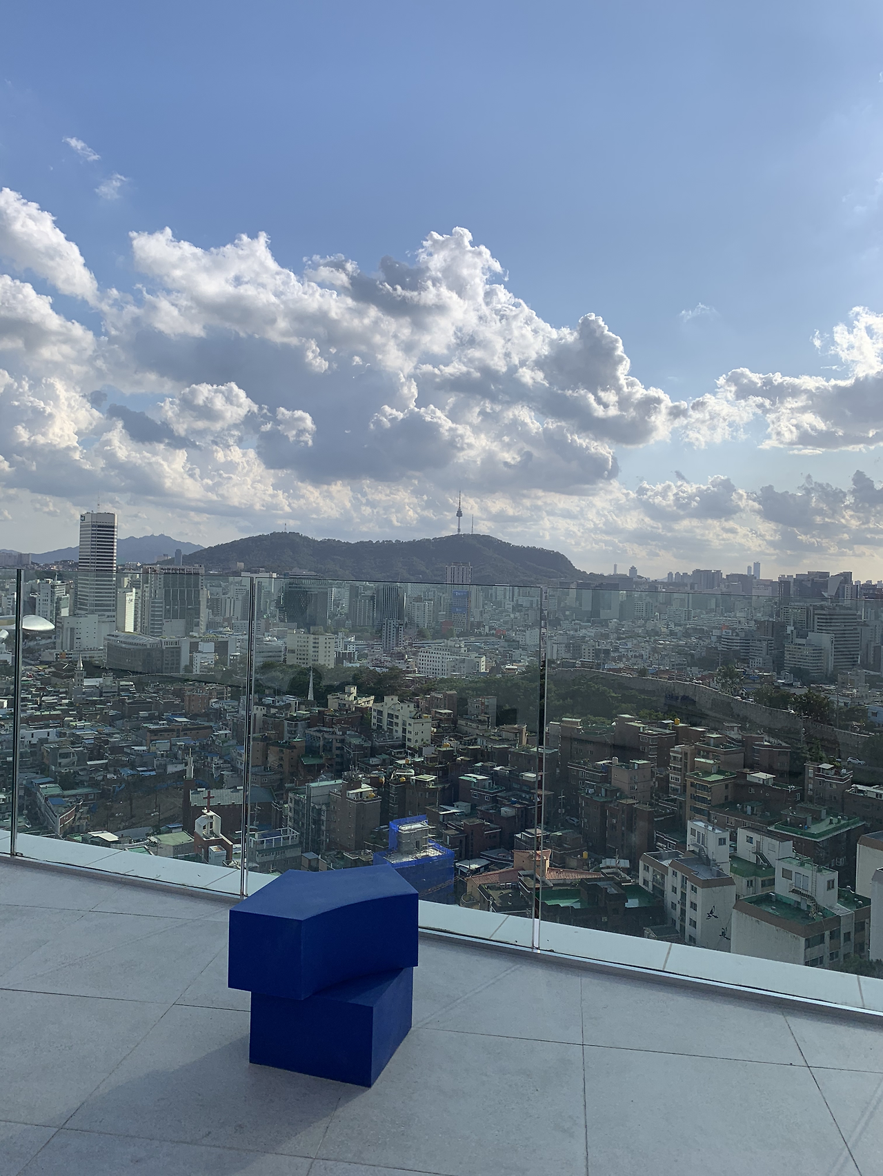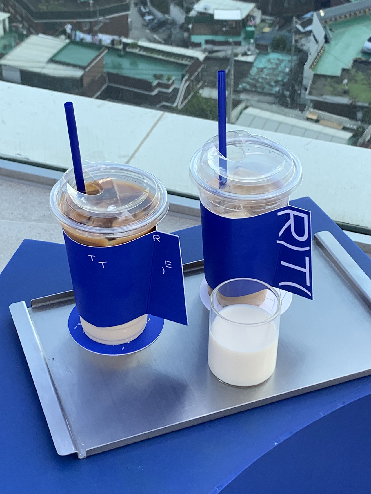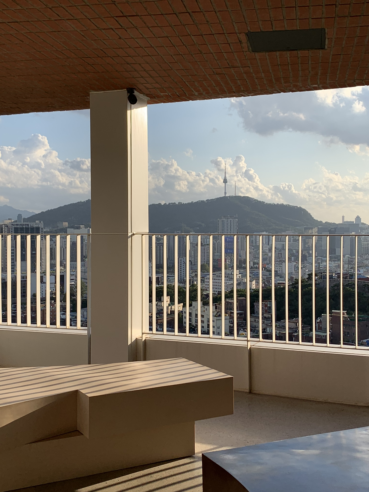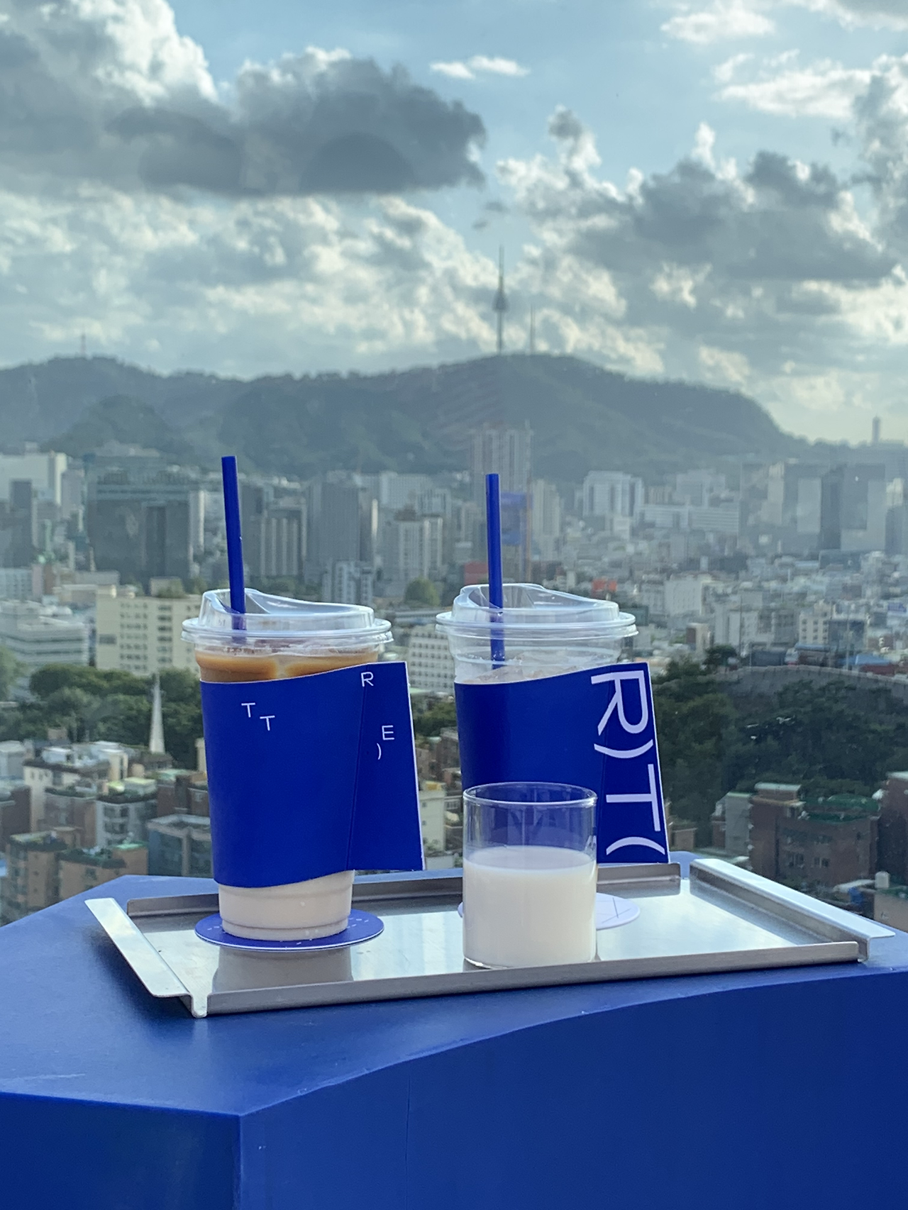 나는 루프탑에 자리를 잡고 앉았다. 독특한 모형의 파란색, 갈색 의자들이 곳곳에 놓여 있었다. 원색적이고 강렬한 색감이라 하얀 공간 속에서 유독 돋보였다. 눈앞에는 탁 트인 도시의 풍경이 파노라마처럼 펼쳐졌다. 날이 어찌나 맑았는지, N타워와 롯데월드 타워 등 서울을 상징하는 건물이 선명하게 보였다. 상쾌한 기분으로 경치를 감상하며, 커피의 시간을 누렸다.