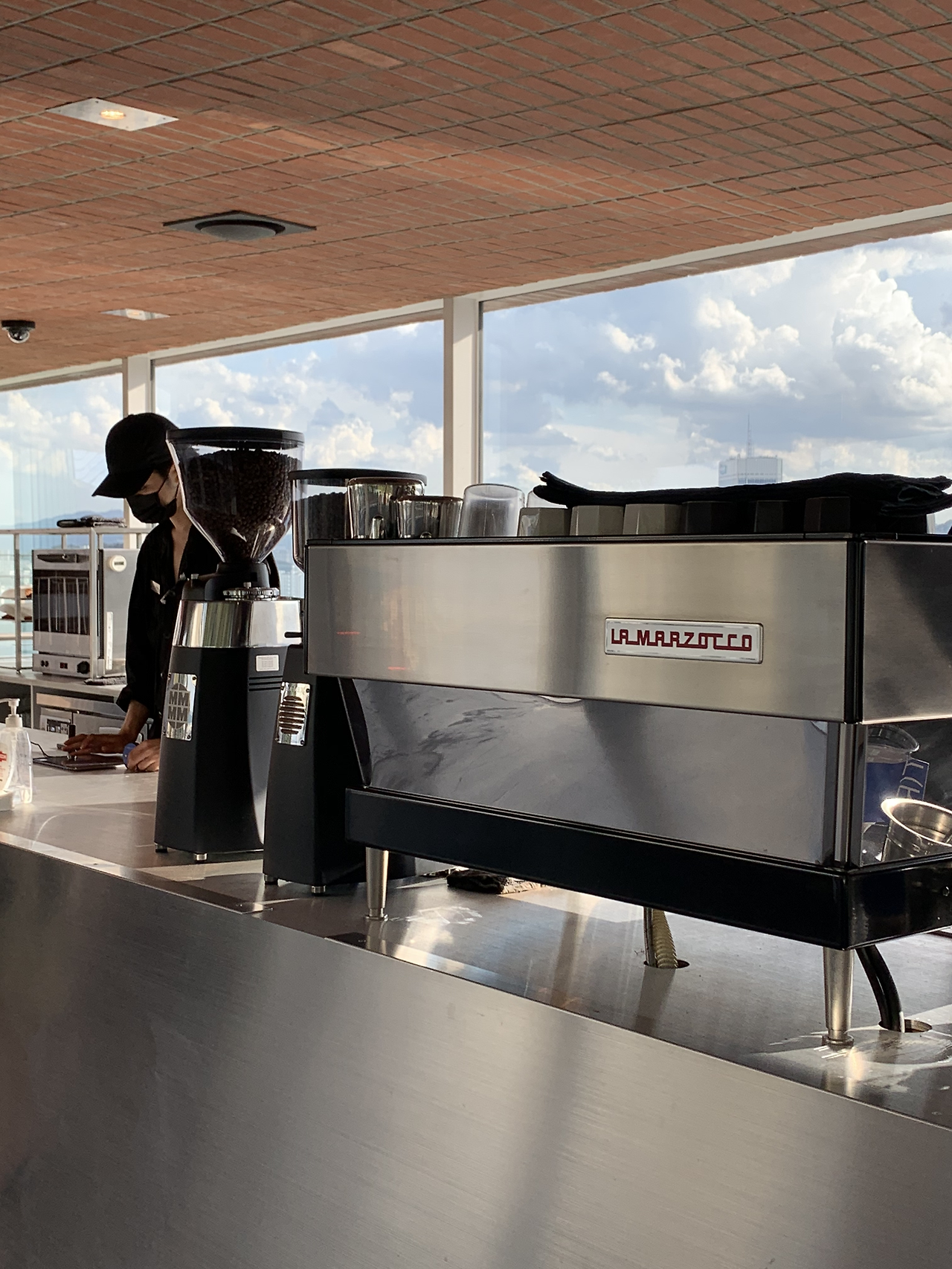 1층에서 주문을 하고, 2/3/4층을 이용할 수 있는데 4층은 루프탑이다. 주문을 하는 공간에도 창밖의 환상적인 풍경이 깔려 있었다. 음료 메뉴는 아메리카노, 라떼(바닐라/블랙), 플랫화이트 등의 기본적 구성과 더불어 에이드, 와인, 맥주, 위스키 등이 마련되어 있었다. 디저트는 크루아상&버터와 치즈구이 그리고 멜론 프로슈토 등이 있었다. 나는 오트 밀크를 추가한 아이스 라떼를 주문했다. 라떼는 산미가 강한 편으로, 오트 밀크 특유의 가벼운 바디감과 잘 어울렸다.