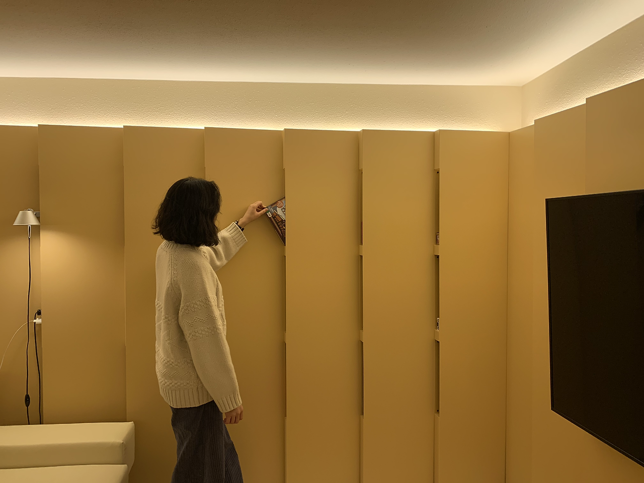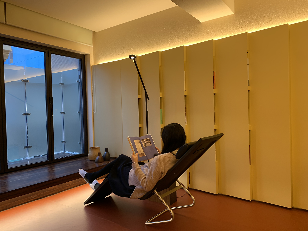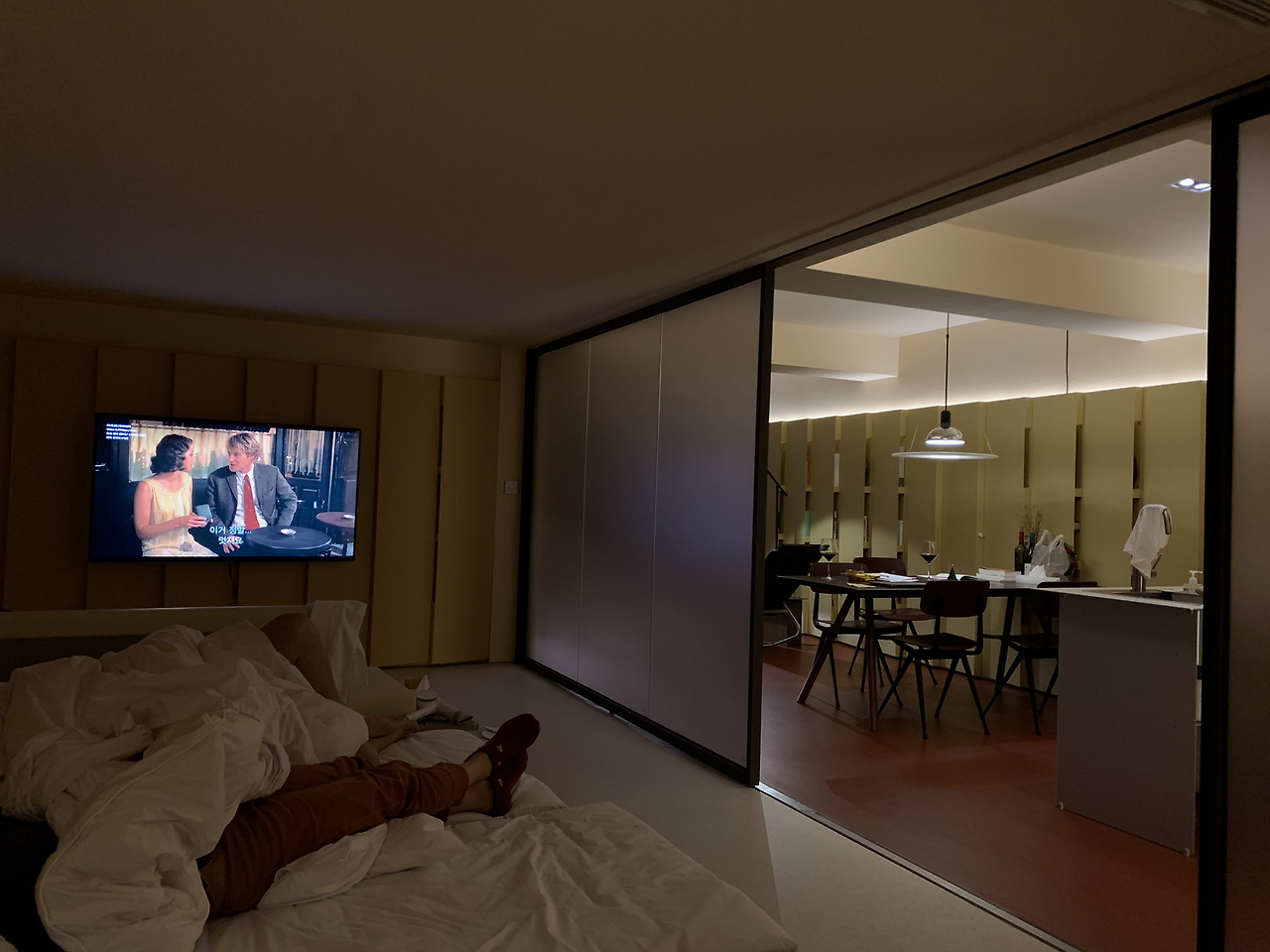 기분 좋은 포만감을 느끼며, 오랜만에 여유로운 '독서의 시간'을 누렸다. 일상 속에서는 출퇴근길이나 잠들기 직전에 잠깐씩 책을 읽다 잠들기 일쑤였는데. 책을 읽는 중간중간 메모를 하고 와인도 마시며 느긋한 시간을 보냈다. 가족들이 침실에서 영화를 보아도 전혀 방해되지 않았다. 침실과 라운지/부엌을 분리할 수 있는 가림벽이 있었기 때문이다. 문을 양쪽으로 완전히 당기면, 두 공간을 아예 분리할 수도 있었다.