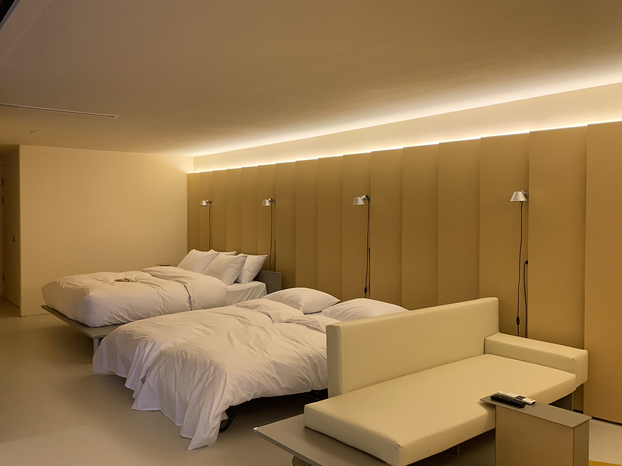 라운지 옆의 침실에서 우리를 '웰컴'해준 것은 음악과 향이었다. 스테이폴리오 숙소답게 음악이 흘러나왔고, 침대에는 수토메 아포테케리의 두 종류의 룸 스프레이(우드/ 허브)가 놓여 있었다. 65인치 TV와 소파 그리고 침대가 나란히 놓인 구조가 전반적으로 호텔 같은 인상을 자아냈다. 침대는 4인 가족이라 킹베드에 더불어 싱글베드가 추가로 놓여 있었다. 침대마다 스탠드 조명이 설치되어 있어 아늑한 느낌을 주었다.