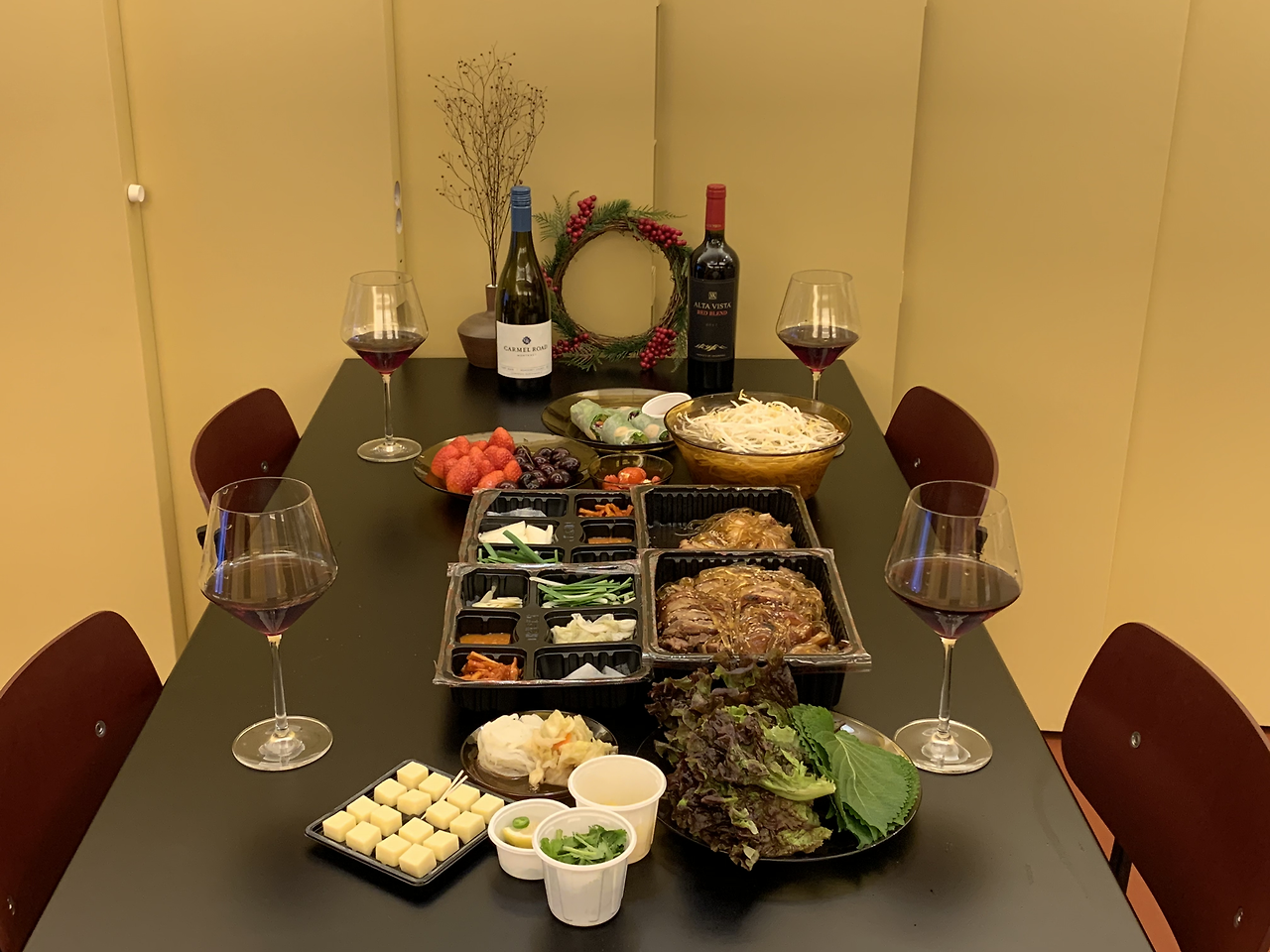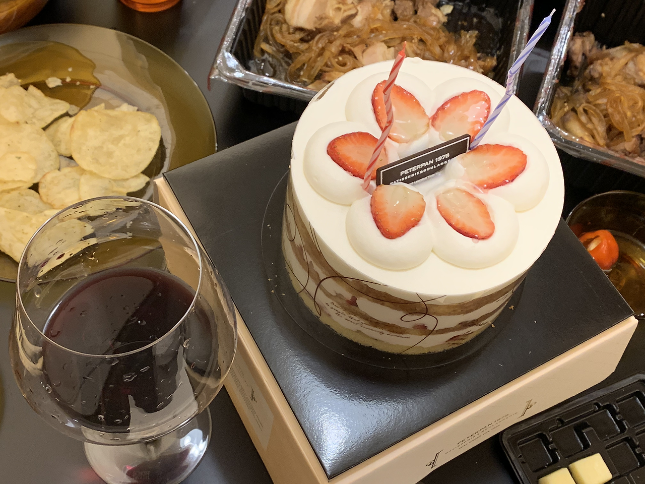 오늘의 만찬은 배달 음식으로 꾸렸다. 근처에 맛집이 즐비해서 배달이나 포장을 이용하기 좋았다. 선택지가 매우 넓어 고민을 좀 하긴 했지만 결국 쌀국수와 족발 세트를 주문했다. 식탁에 풍성한 음식과 더불어 과일과 케이크 그리고 와인까지 차려 두니 크리스마스 분위기를 한껏 느낄 수 있었다.