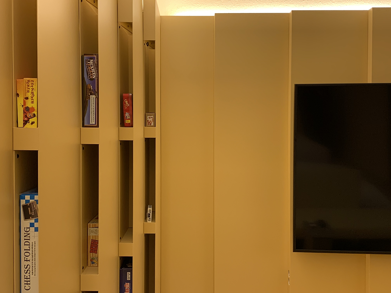 거실과 침실 그리고 부엌을 둘러싼 벽은 모두 '모듈러 월 시스템'이었다. 얇은 서랍장이 층층이 쌓인 벽은 물건을 수납하기에 최적화되어 있었다. 거실 벽에는 디자인/건축 분야의 서적이, 침실 벽에는 각종 보드게임이, 부엌 벽에는 식기류, 그릇 등이 다수 꽂혀 있었다. 이 시스템은 공간을 분할하기도 한다는 점에서 매우 독특하고 효율적이라고 볼 수 있다. 넓은 공간을 갖기 힘든 대도시의 주거에서 활용하기 좋은 기능이었다.