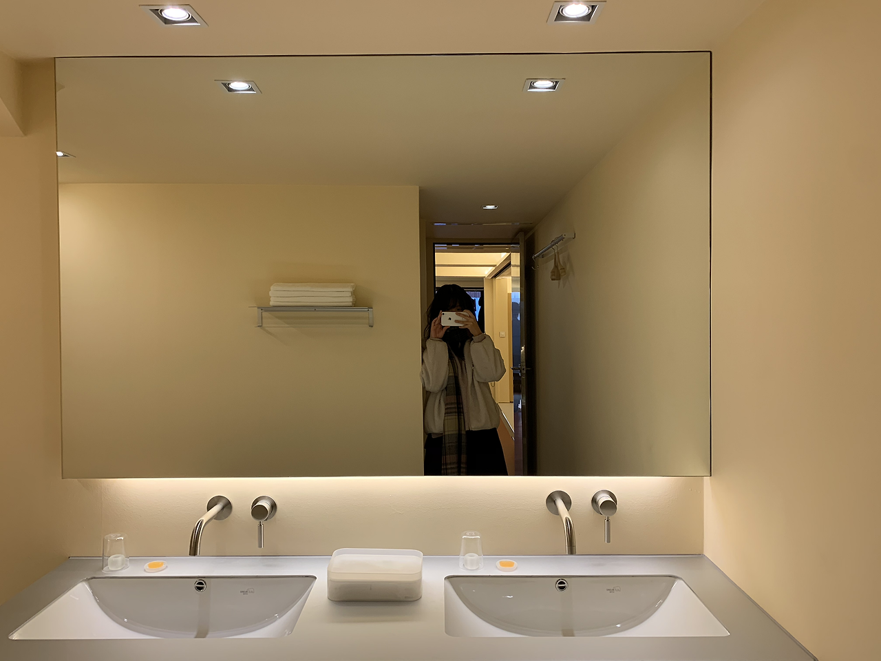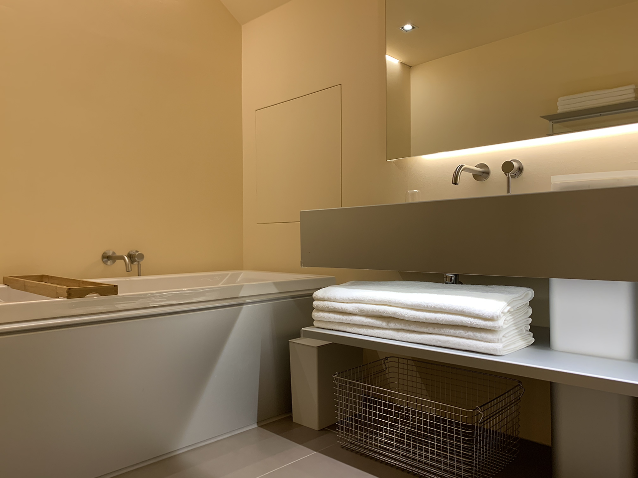 부엌과 연결된 욕실에는 일회용 어매니티와 Aesop 샴푸 및 바디 클렌저가 있었다. 공간이 샤워실/ 화장실 /욕조와 세면대 이렇게 세 부분으로 나뉘어 있어, 여러 사람이 이용하기에 편리하고 쾌적했다. 세면대도 두 개여서 동시에 쓰기 좋았다. 이번 휴가의 콘셉트는 '집콕 휴식'이었으므로, 집을 한 바퀴 둘러본 뒤에 곧장 욕조에 물을 받아 반신욕을 즐겼다.