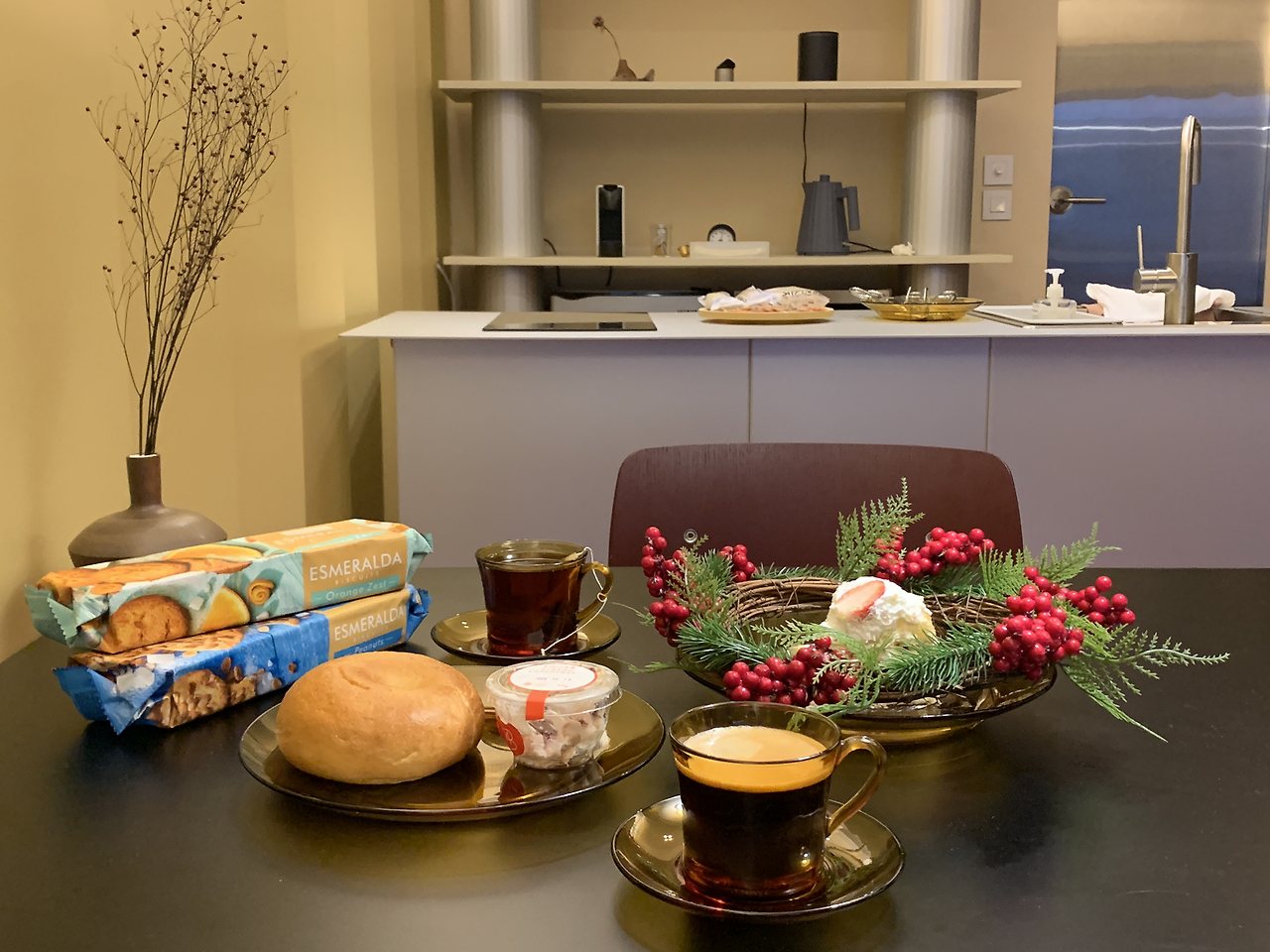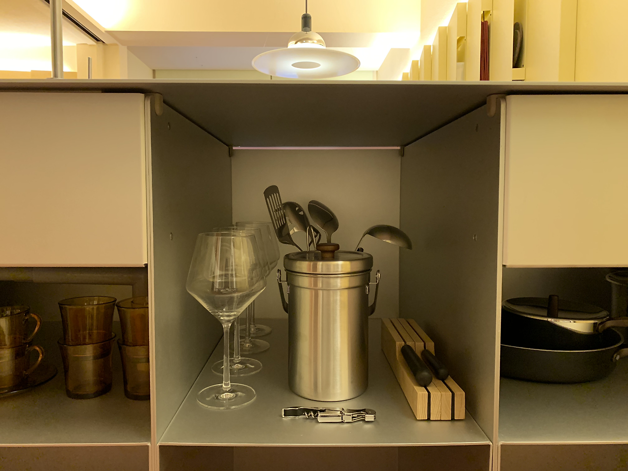 나를 매료시킨 공간은 부엌이었다. 라이트 그레이, 브라운, 블랙 계열의 가구들에 노랑빛의 조명과 벽의 색감이 더해지니 포근한 느낌이 들었다. 넓은 테이블을 보며 이곳에 가장 오래 머물고 싶다는 생각을 했다. 냉장고, 전자레인지, Nespresso 커피머신, ALESSI 주방 용품, 식기류, 와인잔, 와인 오프너 등 웬만한 시설은 다 갖춰져 있었다.
