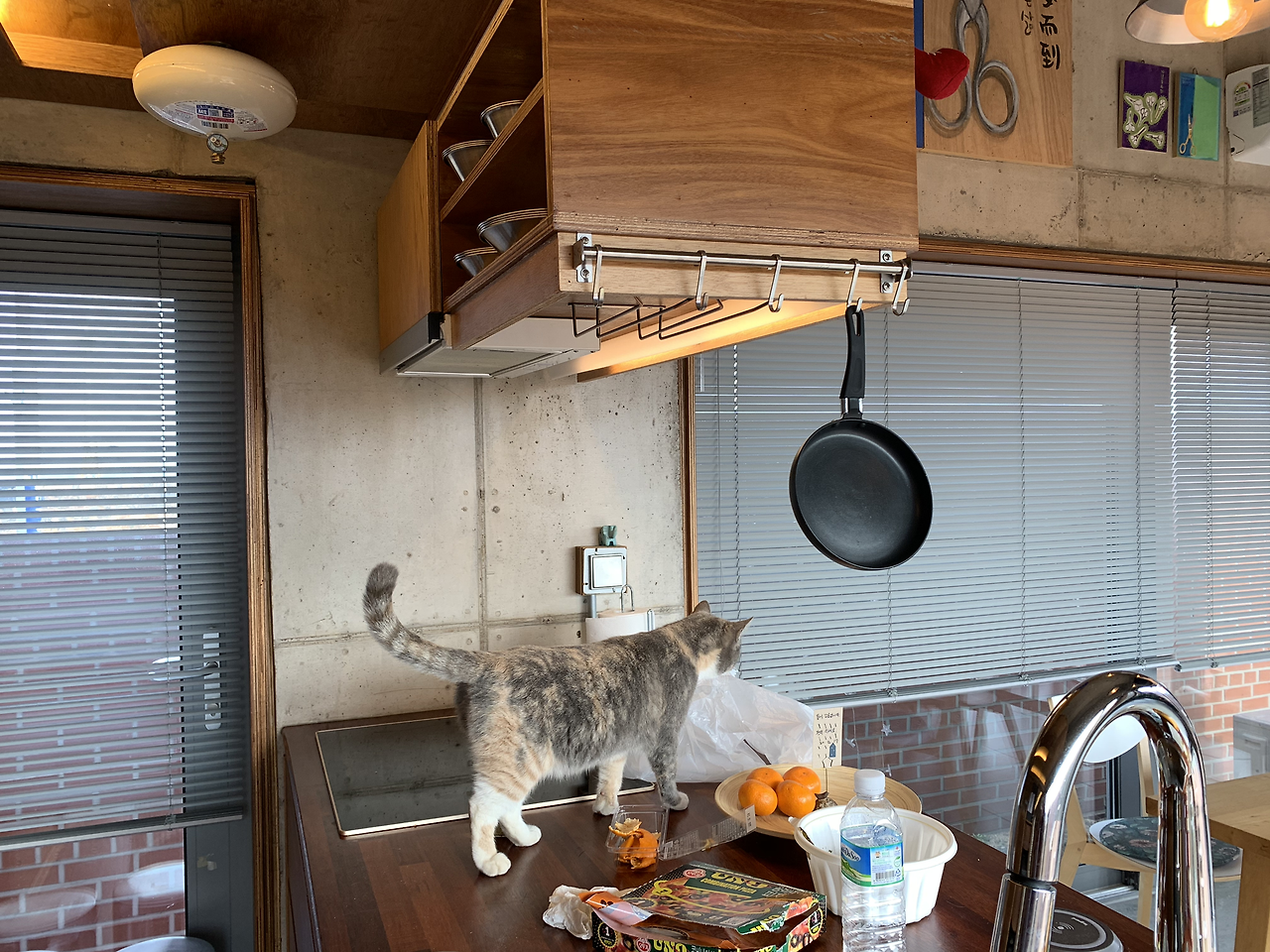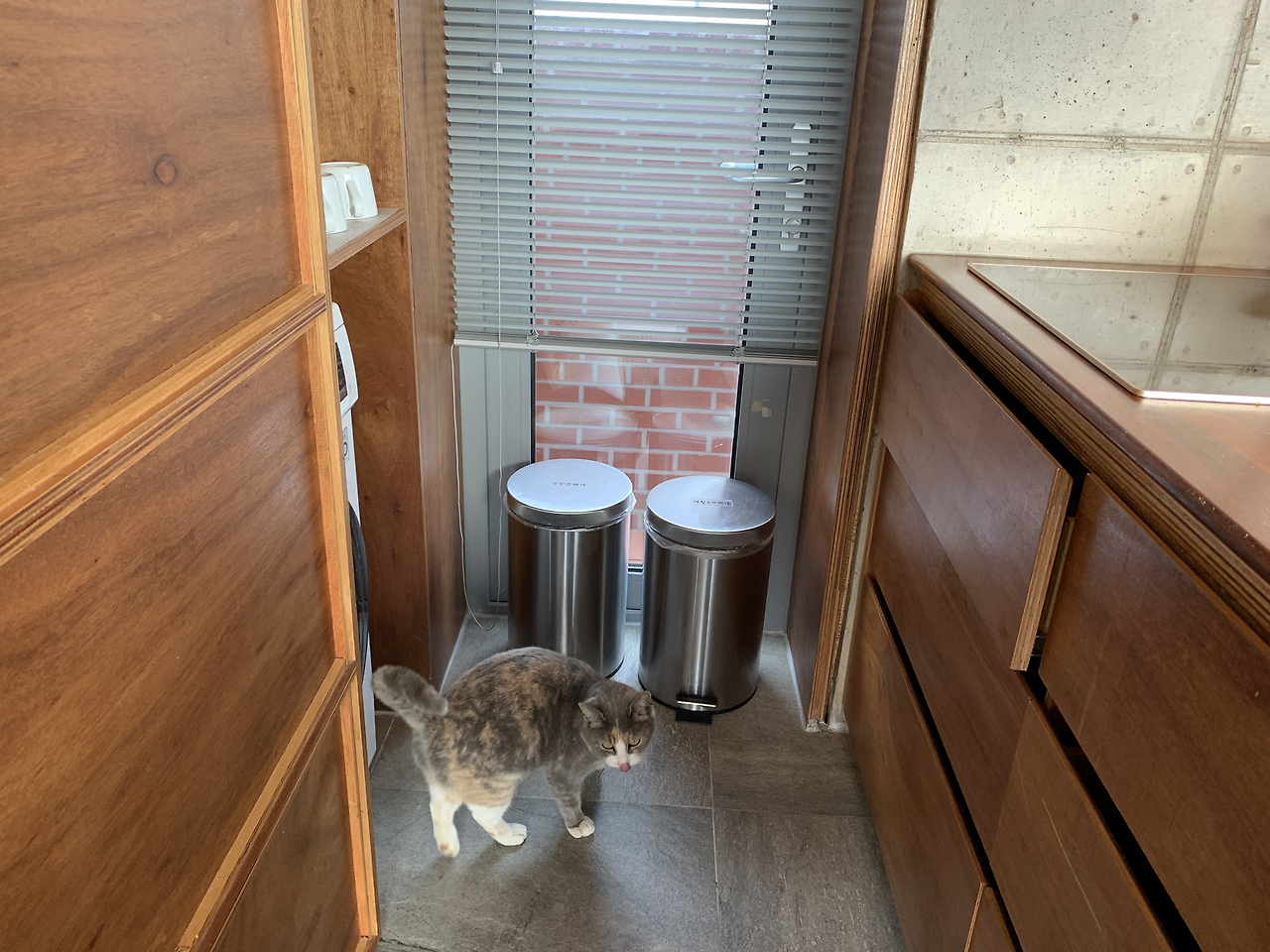 1층은 주방, 큰 테이블, 화장실, 마당과 연결된 테라스가 있었다. 크리스마스 시즌에 방문한 내게 마치 선물과 같은 트리와 루돌프 인형도 있었다. 내부를 제대로 둘러보기도 전에, 또 다른 선물(?)이 등장했다. 마당에서 뛰놀고 있던 고양이. 집에 들어오고 싶은지 계속 소리를 냈다. 문을 열어주자, 냉큼 들어와 우리의 몸과 짐을 샅샅이 훑었다. 고양이 녀석이 이 집의 진정한 주인인가 싶을 정도로 집안 구석구석을 돌아다녔다. 이름 모를 이 귀여운 생명체는 우리의 스테이 내내 함께했다. 밥 먹을 때 같이 먹고, 뒹굴 때 같이 뒹굴고!