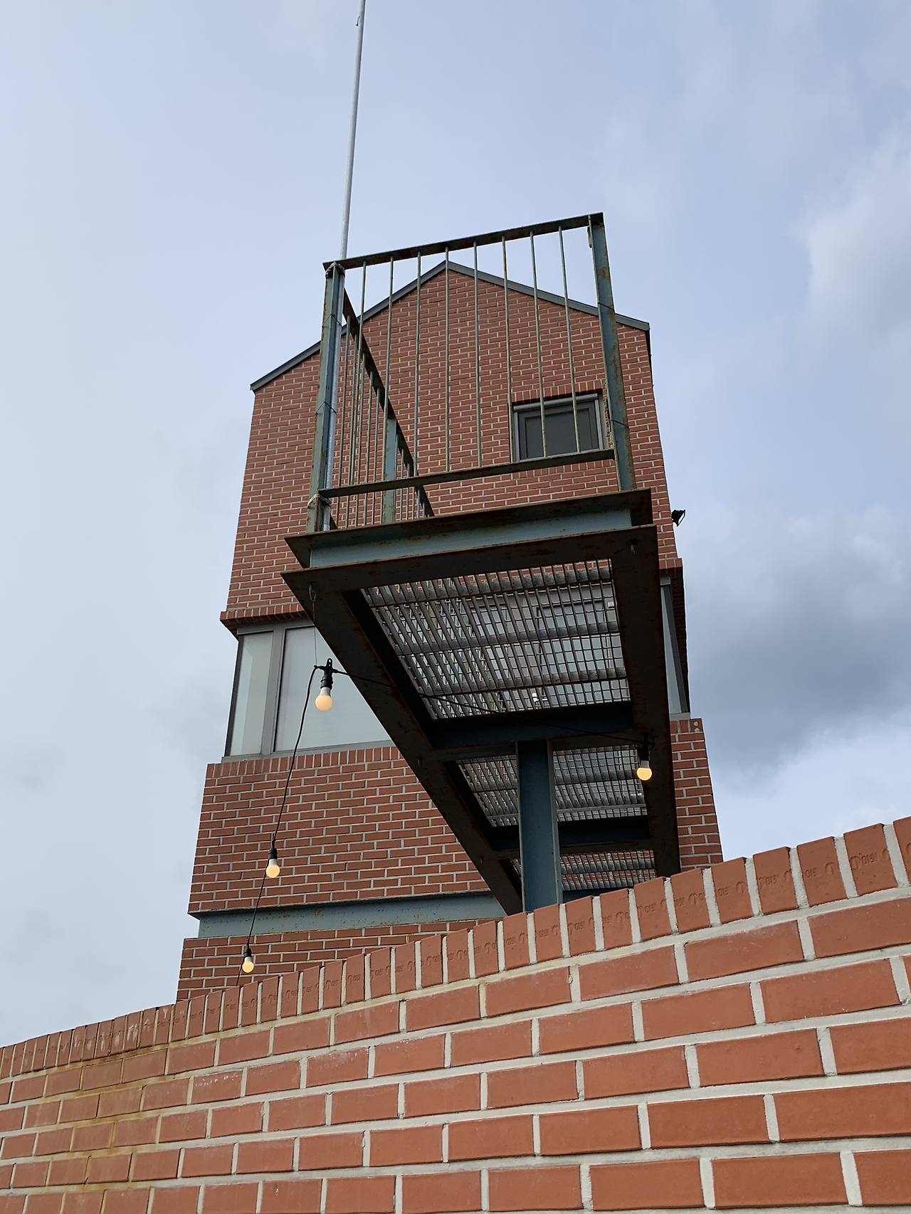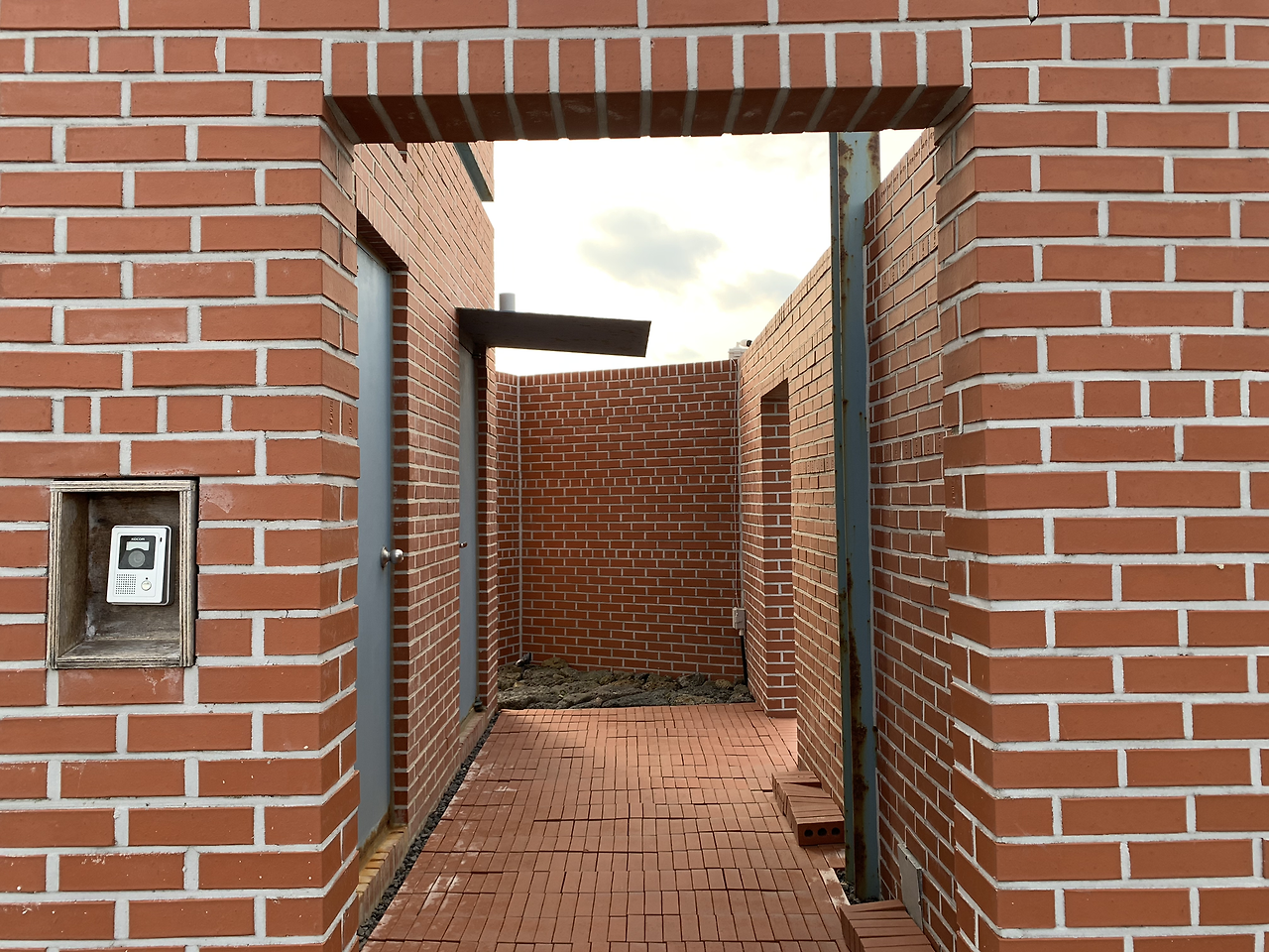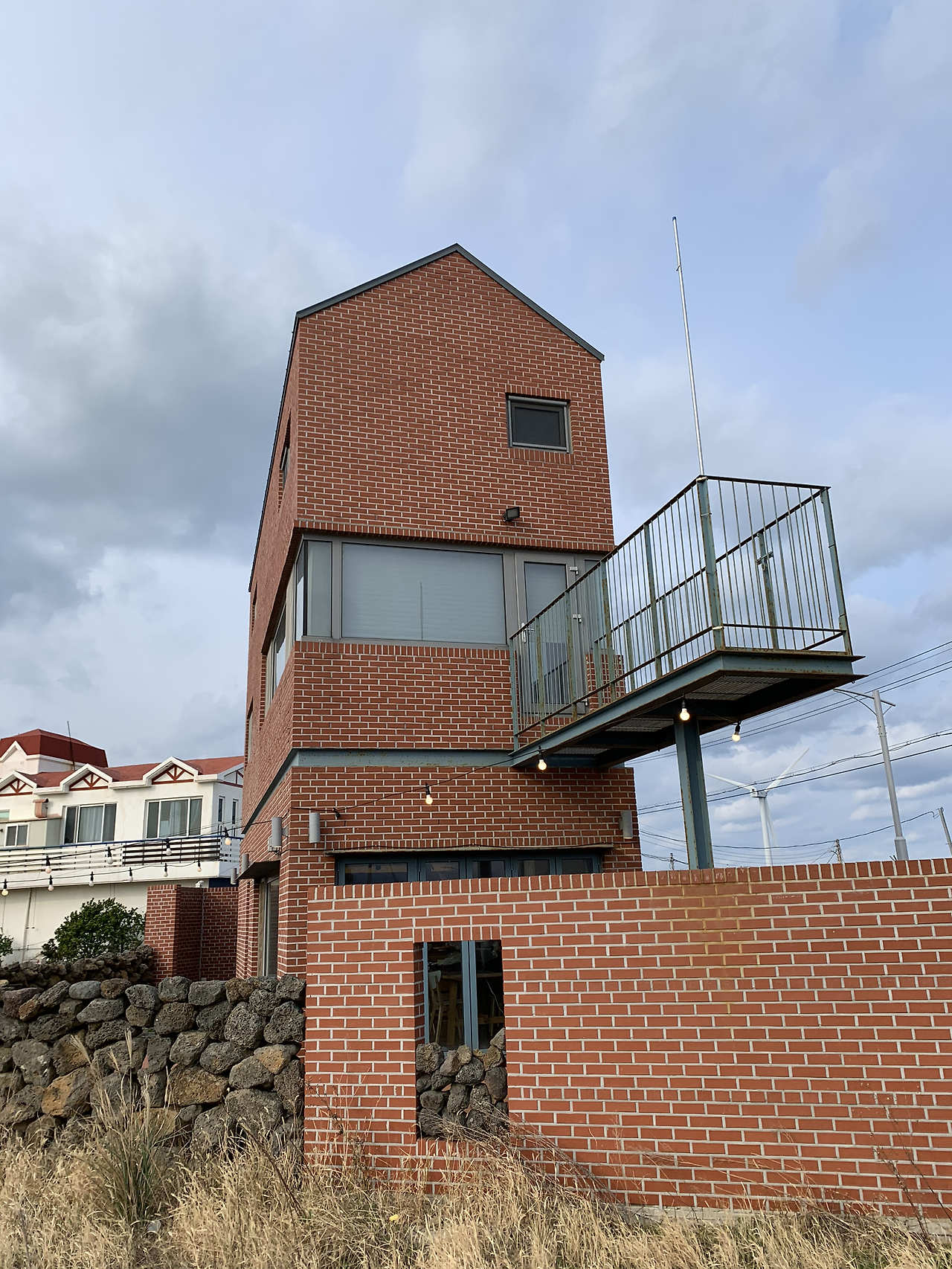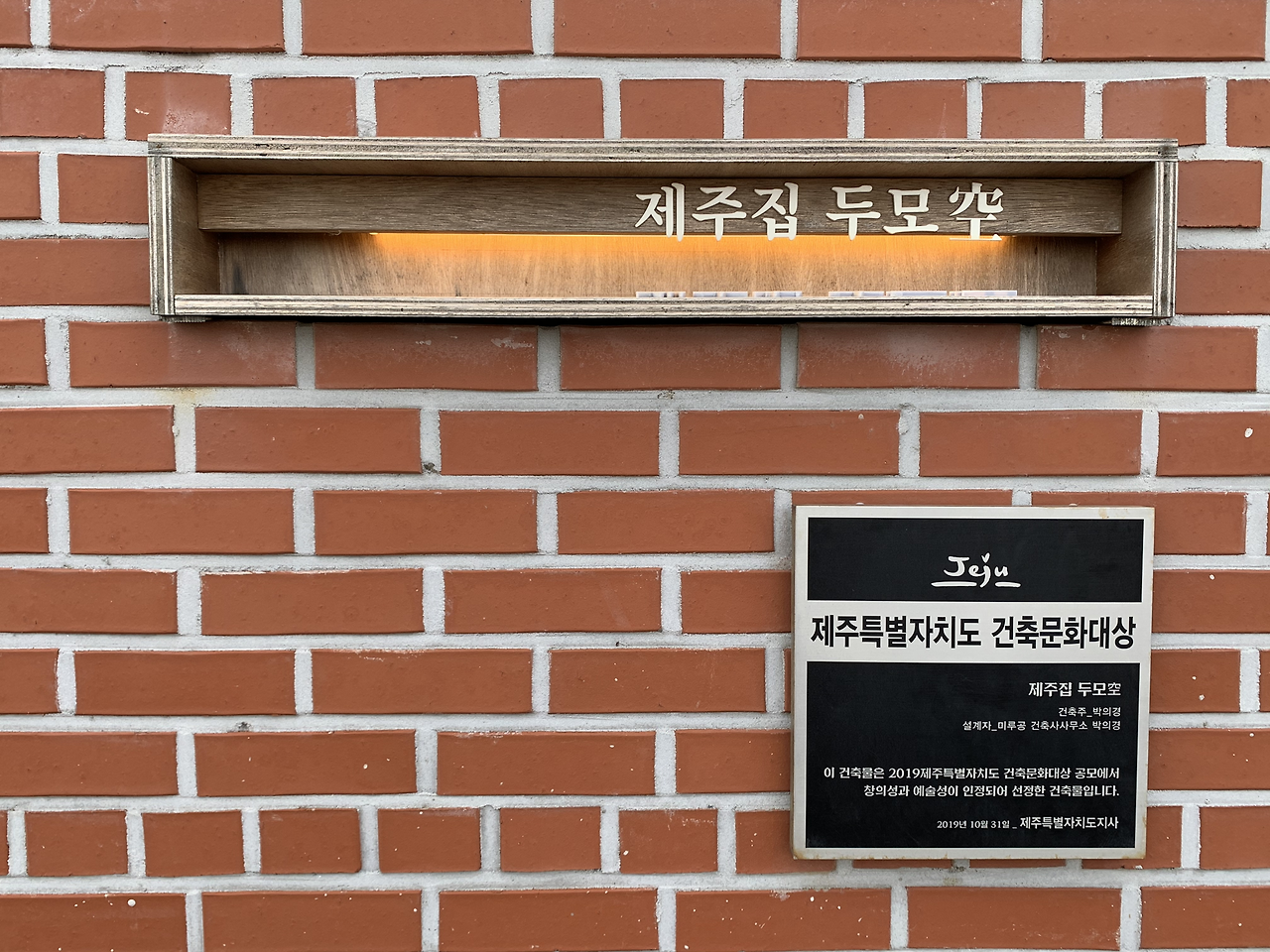저 멀리서부터 한눈에 두모공을 알아볼 수 있었다. 주위의 낮은 집들과는 다르게 홀로 우뚝 솟아 있었기 때문이다. 벽돌이 붉은 색인 점도 한몫했다. 두모리의 고요한 골목길을 걸으며, 숙소와 가까워지자 어서 가닿고 싶은 마음이 들었다. 현관에는 '제주집 두모空'이라는 글자와 함께 작년에 제주 건축문화대상을 수상했다는 현판이 붙어 있었다. 집 입구로 들어가기 전에, 마당으로 나아갔다. 마당에서는 층층이 쌓아 올린 돌벽과 그 너머로 보이는 바다 그리고 창연히 솟은 풍차들이 보였다. 이 모든 요소들이 두모공을 '제주를 오롯이 품고 있는 집'으로 만드는 듯했다.