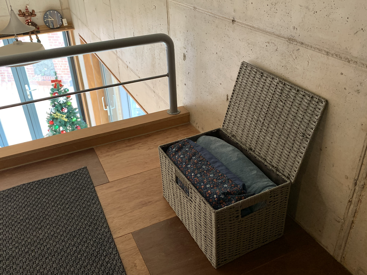 3층에는 침실과 간이 주방이 있다. 마찬가지로 나무벽과 지붕이 사방을 둘러싸고 있는 데다가 주홍빛 조명까지 더해져 우아하고 아늑한 분위기를 자아낸다. 주인장님의 섬세한 배려는 이곳까지 닿아, 미니 크리스마스트리가 창문가에 놓여 있었다. 성탄 분위기를 느낄 기회가 없던 요즘, 이렇게라도 경험하니 이 순간이 매우 소중하고 감사했다. 침실 한쪽 벽면에 놓인 수납장은 공간이 꽤 넓어 장기 숙박객에게 유용히 쓰일 것 같다는 생각이 들었다.