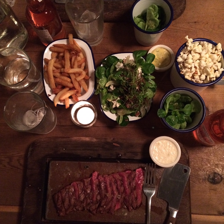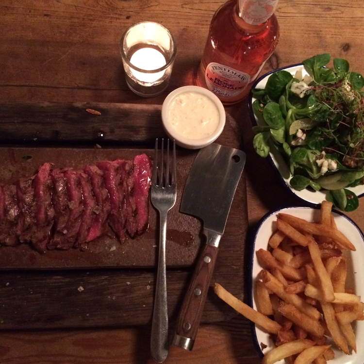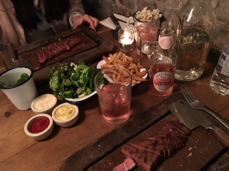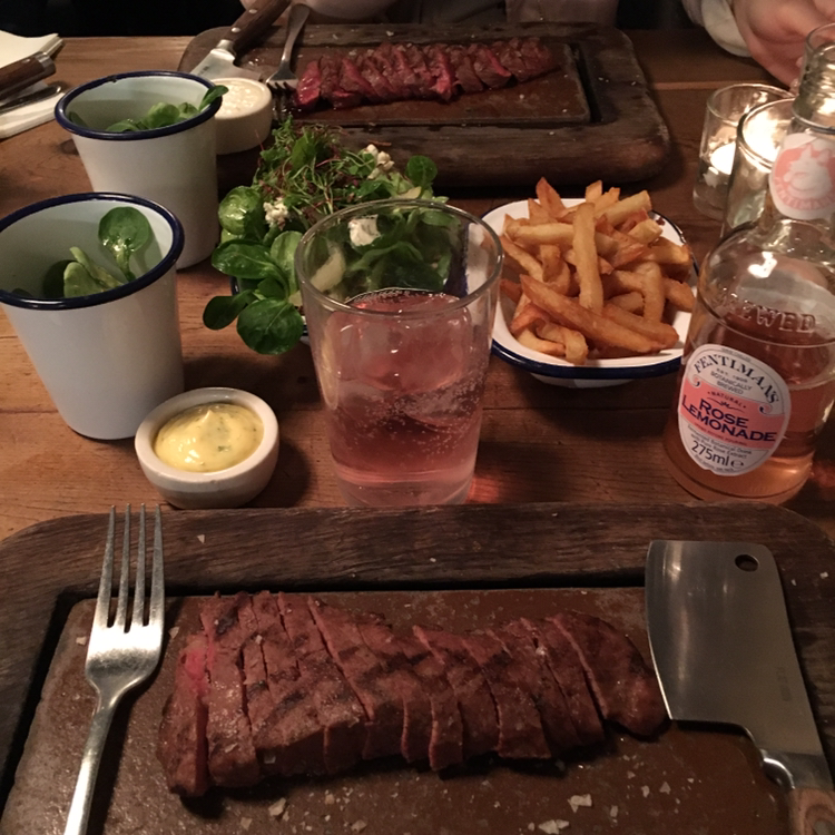 런던의 명동이라고 할 수 있는 피카딜리 서커스 부근에 위치한 'FLAT IRON'은 런더너들 뿐만 아니라 이미 한국인들 사이에서도 정평이 난 곳이다. 워낙 유명한 곳이라 대기는 기본적으로 감안하고 방문하는 것이 좋겠다. 나 역시 오후 4시라는 정말 애매한 시간에 갔는데도 20분 정도 기다렸다. 플랫 아이언은 런던에 총 4군데가 있는데 내가 갔던 Carnaby Beak St 지점은 내부 웨이팅이 불가능해 밖에서 기다리다가 번호를 남기면 문자를 보내준다고 했다. 영국 번호를 처음으로 써본 순간이라 괜스레 떨리고 짜릿했다. 주변에는 구경할 만한 상점이 즐비했으므로 대기하는 건 전혀 문제가 되지 않았다. 플랫아이언이 런던 맛집으로 떠오른 이유는 10파운드라는 저렴한 가격에 스테이크를 즐길 수 있어서다. 이곳의 메뉴는 스테이크 단 한 가지. 여기에 사이드 메뉴와 음료, 디저트 등을 추가로 시키는 구조다. 호스텔에서 만난 친구 덕에 최고로 인기 있는 이곳에 와보다니! 우리는 감자튀김과 샐러드 그리고 점원 언니가 추천해준 소스와 음료도 함께 주문했다. 메인 요리가 나오기 전에 먼저 맛본 로즈 레모네이드는 충격적으로 맛있었다. 한국으로 가져가면 대란이 예상되는 맛이었다. 맛, 색깔, 병 디자인의 삼박자를 고루 갖춘 로즈 레모네이드. 한 입 꿀꺽하자마자 입 안에 퍼지는 상큼한 장미향이 스테이크와도 참 잘 어울렸다. 스테이크 또한 기대 이상으로 맛있었다. 와사비 맛이 나는 소스에 고기를 살짝 찍어 먹으면 입안에서 그냥 녹아내렸다. 사이드로 시킨 감자튀김과 샐러드도 훌륭했다. 맛집으로 떠오른 데엔 이유가 분명 있구나. 막 배부르진 않았지만 적당한 식사를 마치고 나왔다. 가격은 스테이크와 사이드메뉴, 음료를 모두 포함하니 인당 19파운드 정도로 비쌌지만 아깝지 않았다.