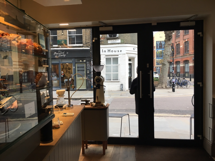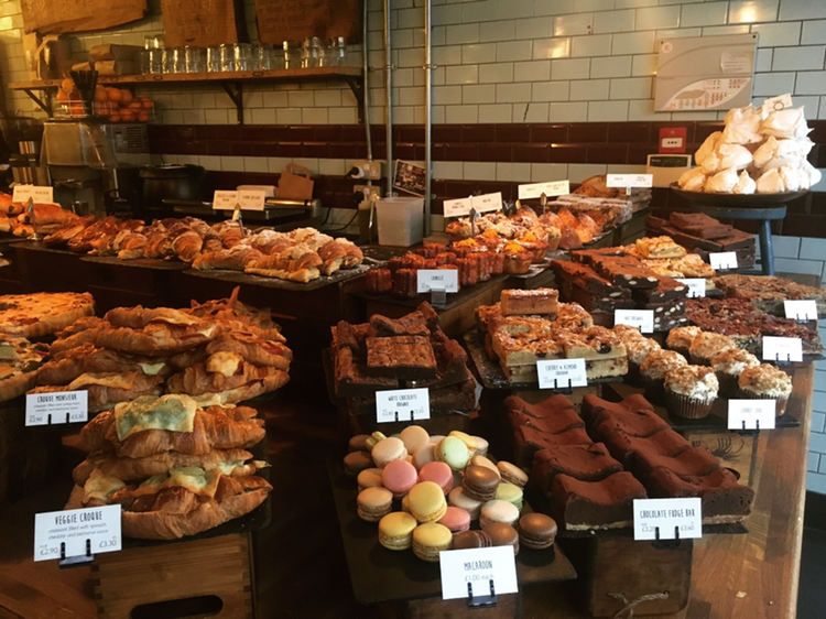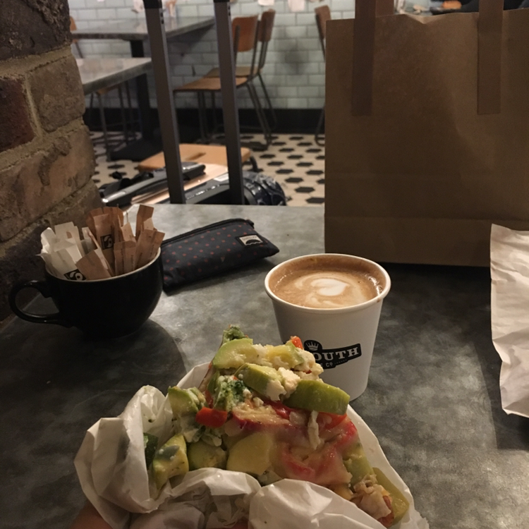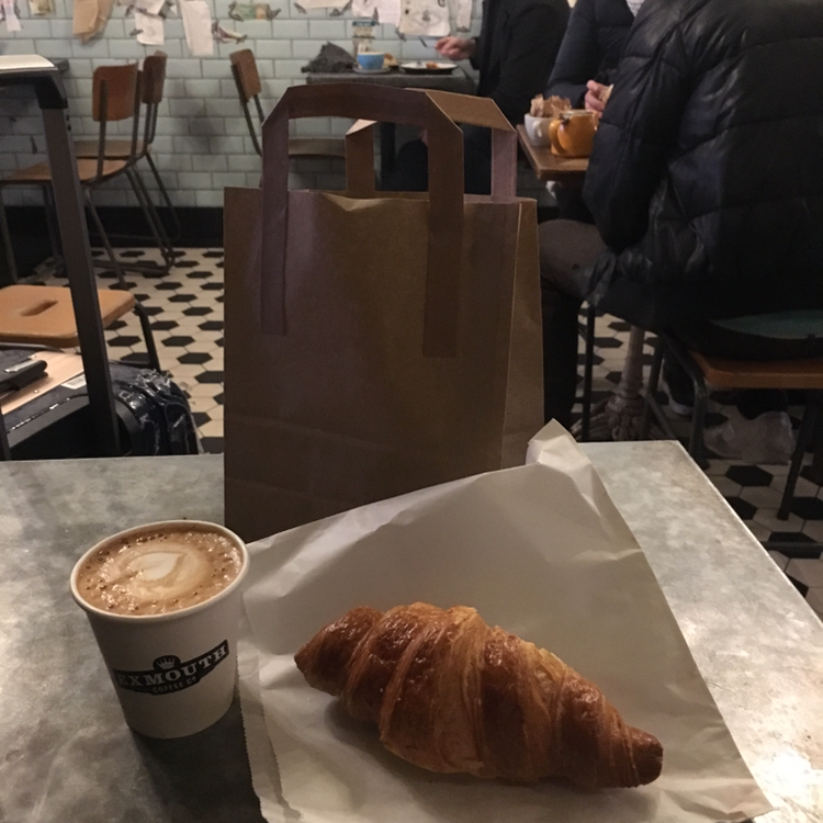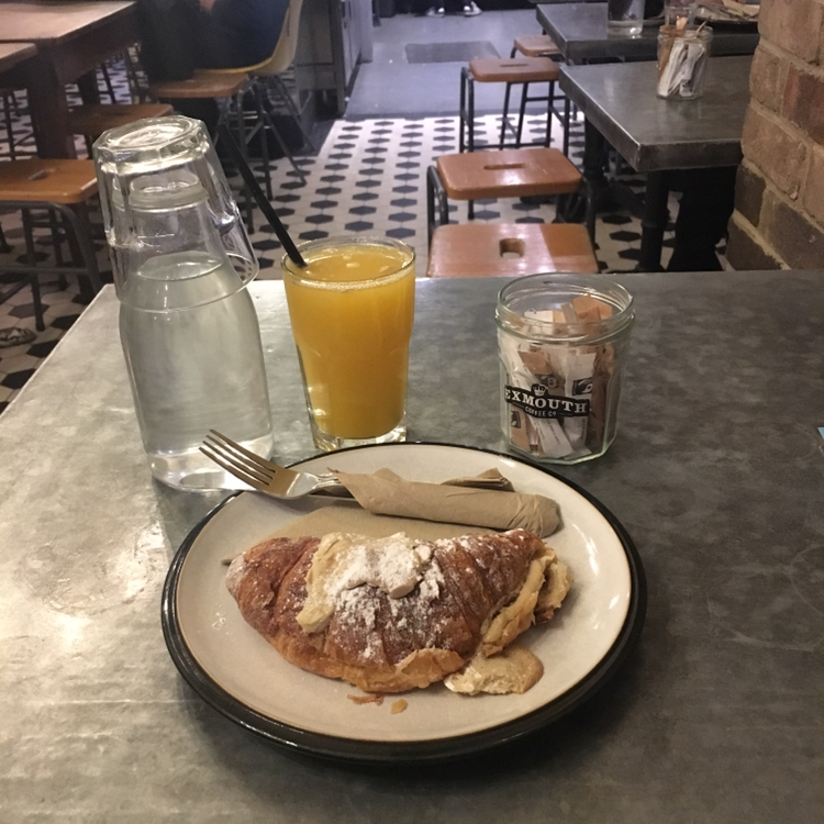 나에겐 최고의 카페이자 유일하게 두 번을 갔던 'Exmouth coffee'. 런던에서 가장 오래 머물렀던 숙소 근처여서 아침에 가기 편했다. 유럽식 카페에 대한 기대치를 완벽히 충족시켜준 이곳은 빵, 커피, 분위기 모두 완벽했다. 찾기 힘든 맛집처럼 골목길에 숨어있지는 않았지만 자그마한 간판 조차 없는 것은 이곳의 또 다른 매력이었다. 출근길에 들른 런더너들과 함께 마주 보고 앉아 크루아상과 오렌지주스를 먹으니 잠시 동안 여행자의 기분에서 벗어나 평온함을 느낄 수 있었다. 새로운 하루를 시작하는 여느 사람들처럼 나도 이곳에서 오늘은 어떻게 보낼지 생각했다. 한국에 있는 친구와 영상통화를 하면서 안부를 주고받았는데, 친구가 내가 영국에 있는 게 믿기지 않는다고 했다. 나도 그래. 이게 꿈인지 현실인지 분간하기도 전에 난 한국으로 돌아갈 것 같아. 대도시의 화려함을 엿보면 엿볼수록 오히려 내 마음은 어딘가 허해지는데, 그래도 일상을 벗어나 새로운 세계를 경험하는 것 자체가 보이지 않는 행복감을 가져다 주기도 해. 'Exmouth coffee'를 두 번째 방문했을 때는 조금 더 욕심을 내서 크루아상 한 개와 각종 야채로 둘러싸인 파이, 플랫화이트를 주문했다. 크루아상은 헤이스팅스로 향하는 기차 안에서 먹으려고 아껴뒀고, 자리에 앉아 파이를 먹는데 애호박과 파프리카가 잔뜩 들어가 있었다. 건강한 맛이 나서 좋았다. 플랫화이트는 언제나 느끼는 거지만 양이 작아서 아쉽다. 이렇게 맛있는 커피를 10분도 안 걸려서 다 먹게 된다니. 화이트채플 갤러리 바로 옆에 있는 이곳은 정말 현지인들이 모여드는 힙한 카페임이 분명하다.