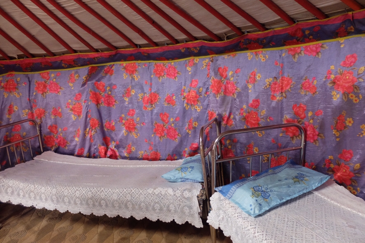 오늘의 게르도 아늑한 실내를 자랑했다. 어제 낯선 환경으로 인해 잠을 설쳐서 이번에도 같은 자리에 누우면 좀 더 적응력이 생기지 않을까 싶어 문가에서 두 번째 침대를 내 자리로 삼았다. 게르 밖엔 탁 트인 풍경과 쉬기 딱 좋은 정자가 있었다.