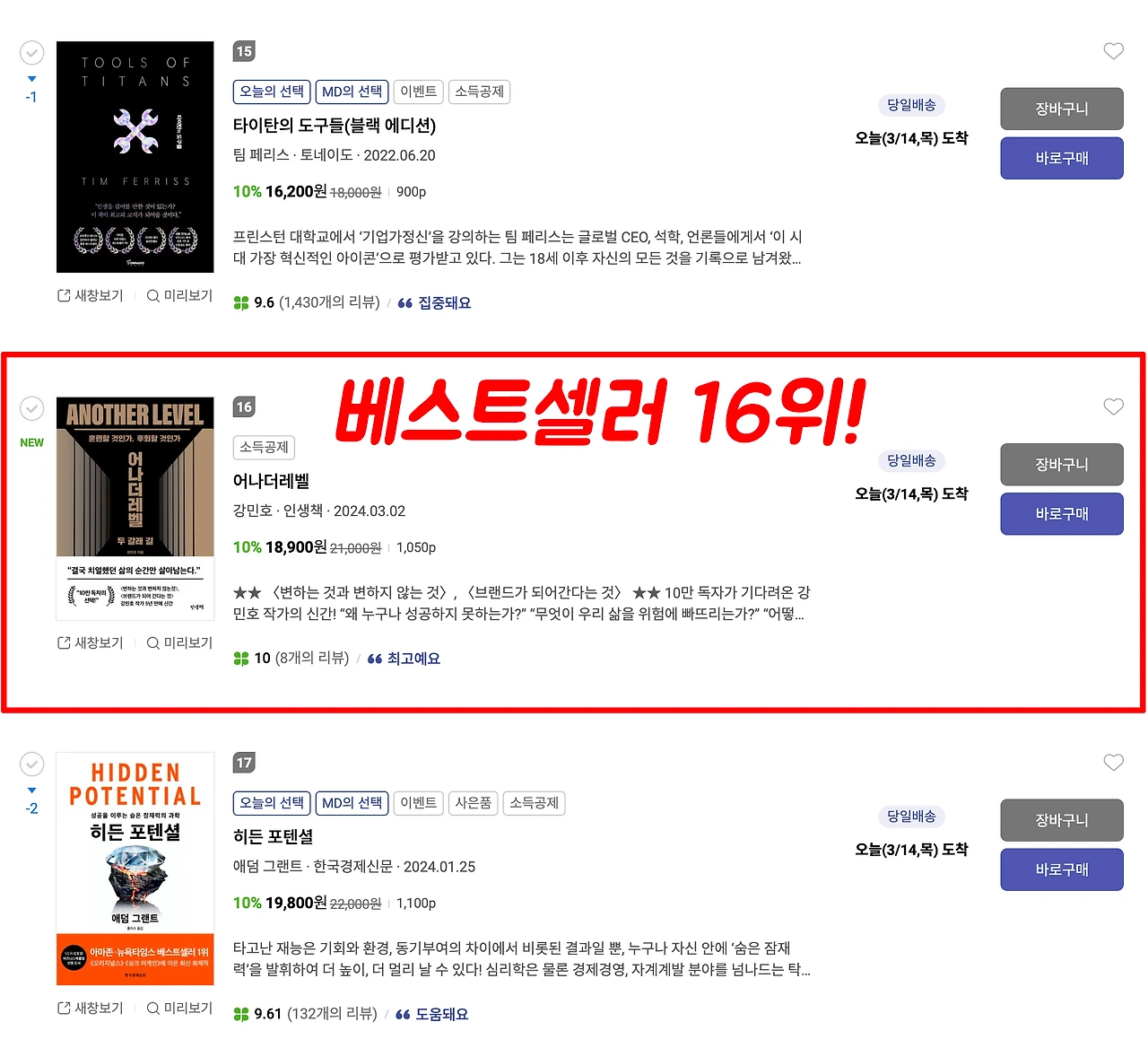 팀 페리스의 <타이탄의 도구들>, 애덤 그랜트의 <히든 포텐셜>과 같은 쟁쟁한 책들과 함께 베스트셀러 목록에 들어가게 되어 기쁩니다.