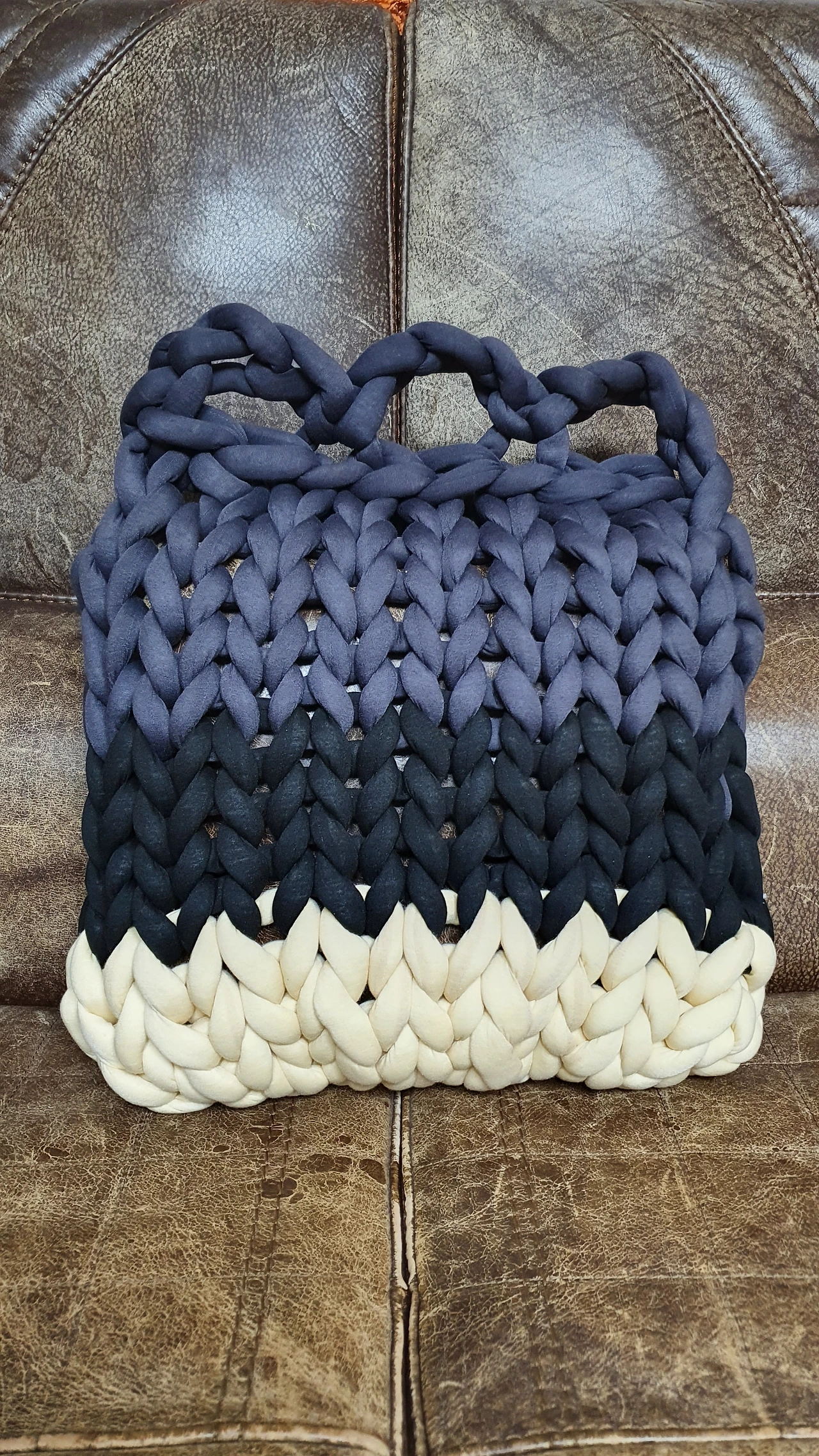 그것을 만들고 나서의 만족도가 커서 올려보는 것이다. 요즘 젊은 세대들이 놀이다운 놀이가 무엇인가를 찾다가 곱창굵기의 자이언트얀이 생겨 그것으로 가방도 만들고 쿠션, 러그, 귀여운 양이의 집 등등을 만들면서 새로운 재미에 빠져 있다는 얘기를 듣던 중 만들어 본 쿠션이다.