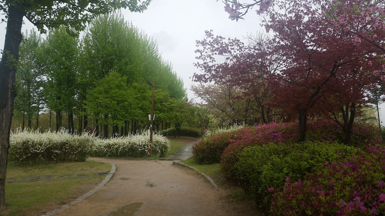 조팝나무가 하얗게 피어나고, 봄꽃이 많이 그러하듯 다홍빛 영산홍, 뽀얀 배꽃, 돌단풍의 톨통한 빛깔, 푸른 잎을 가진 황매화, 전나무의 새순, 아직 꽃은 없지만 그것을 준비하는 인동초, 여기저기 뿌연 피부를 지닌 자작나무들, 하락하락 잎사귀를 휘날리는 귓불이 반짝이는 미루나무, 빗물의 무게를 감당하며 바람결에 흩날리는 새로 핀 단풍나무 가지의 흔들림, 간간히 놓여있는 빈 의자 위에 떨어진 꽃잎, 그리고 유유히 흐르는 휘억한 강물.