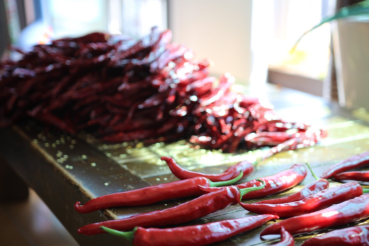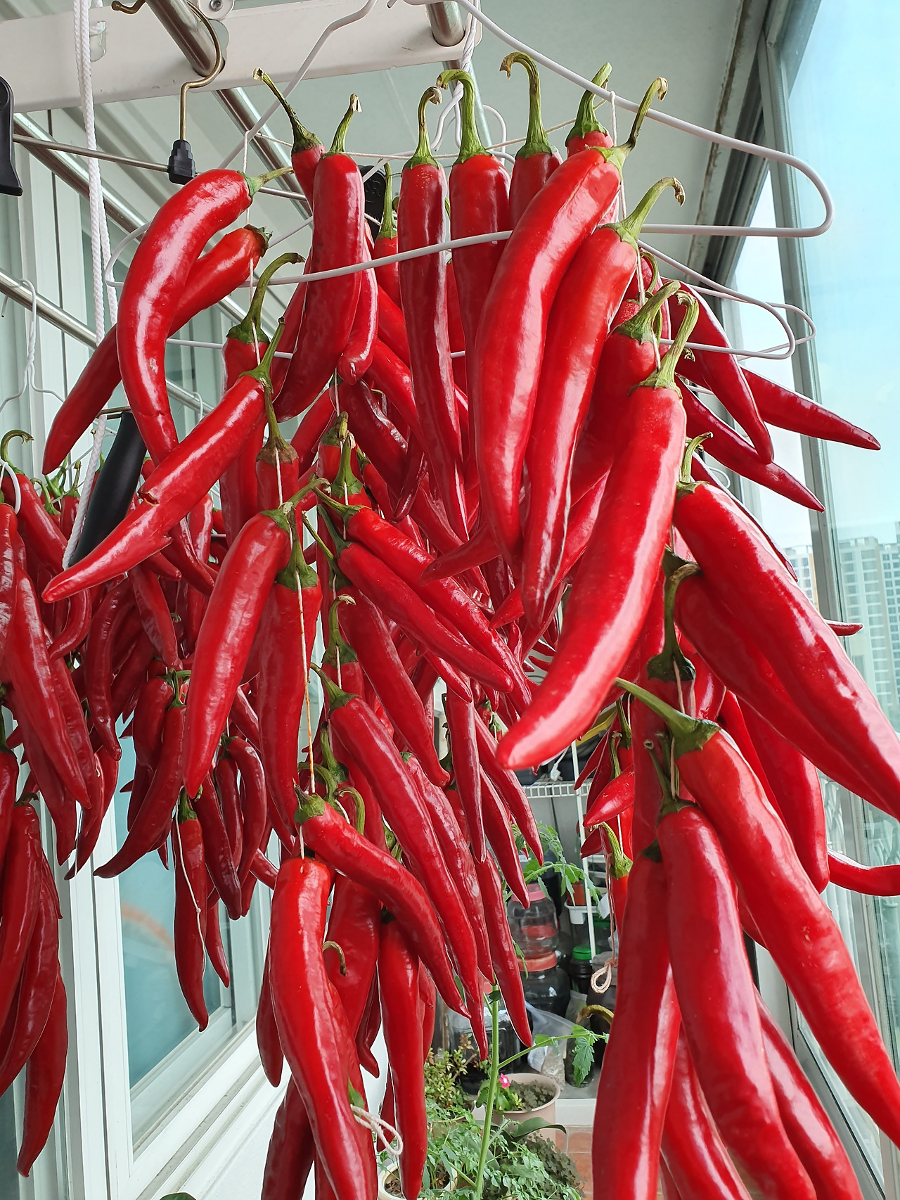 우리 동네에는 햇빛을 아까워하는 사람이 여럿 산다. 요즘 알고 지내는 사람 중에는 그래서인지 팔월부터 고추를 실에 꿰어 너는 게 유행이다. 실에 꿴 고추를 옷걸이 양끝에 척척 걸친 다음, 베란다에서 4~5일 숙성시킨다. 숙성을 시키는 이유는 아직 덜 익은 고추는 바로 햇빛에 내놓으면 하얗게 바래지기 때문이란다.