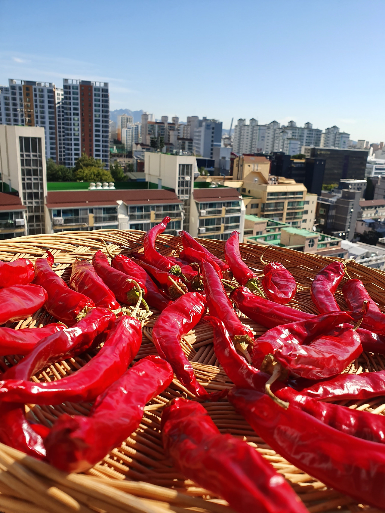 고쳐 달러 온 아저씨가 실외기 위에 올려진 고추 채반을 보고 내 속까지 개운하게 잘 마르는 것 같다며, 어디서 이리도 실한 고추가 왔느냐고 묻기도 하더라고, 집을 비운 동안 본 아이들이 내게 말해준다.