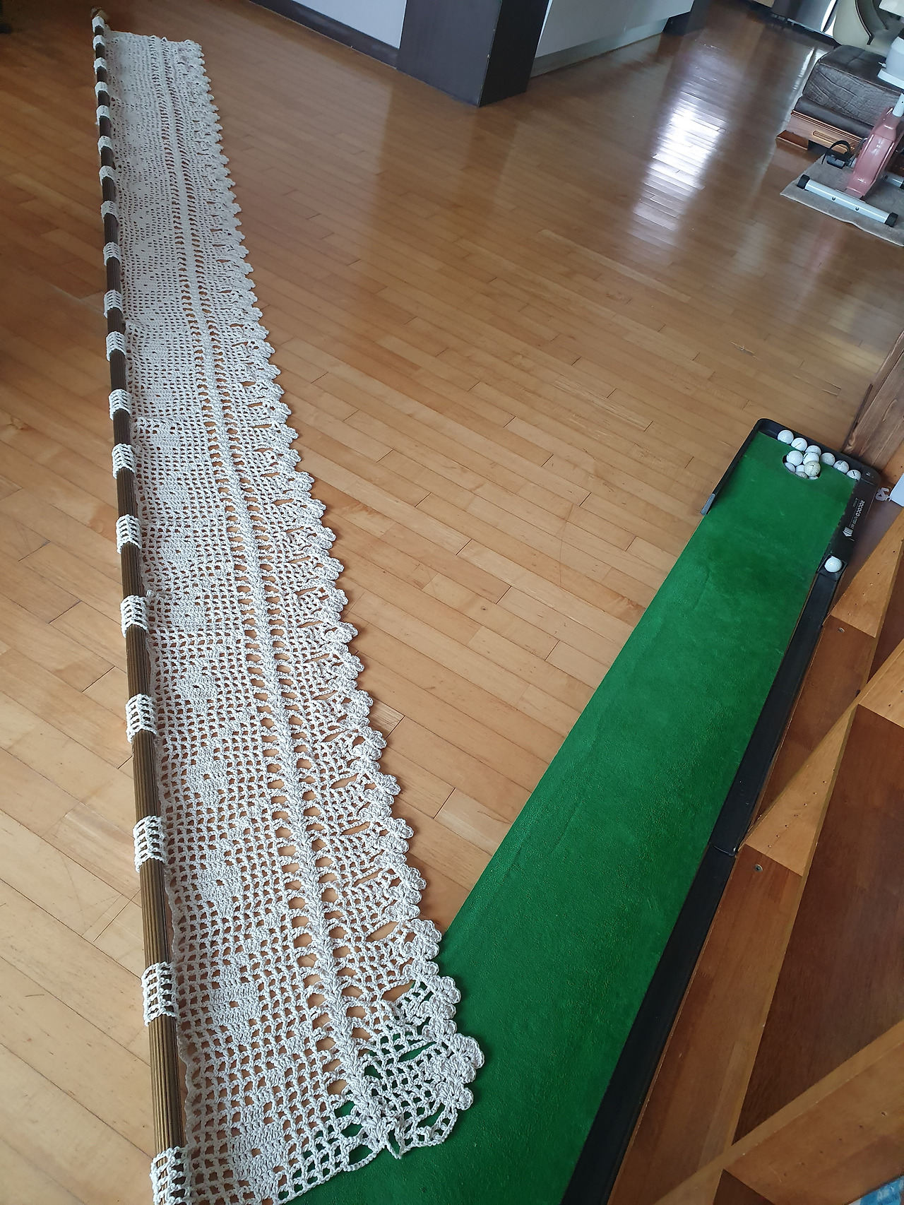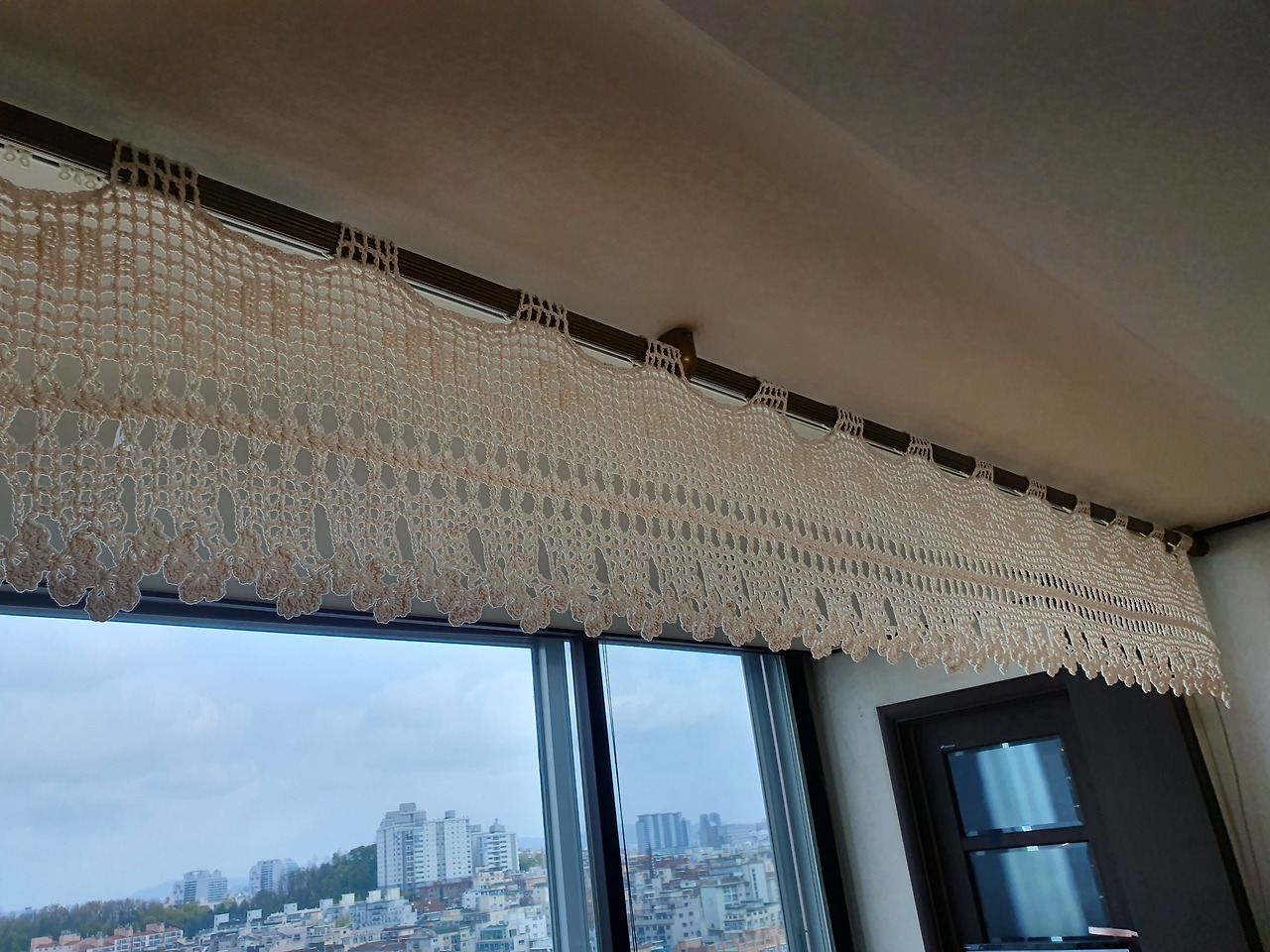 그랬더니 도면도 보여주고 최근에 자신이 뜨던 샘플까지 가지고 나와서 설명해 주었다. 차도 마시고 이런저런 간식도 먹으면서 모처럼의 만남이라 요즘의 어려운 속사정도 얘기하다 보니 한참 만에야 헤어질 수 있었다. 샘플을 들고 가라고 빌려주기까지 해 집에 도착하자마자 커튼 뜨기를 시작했다.