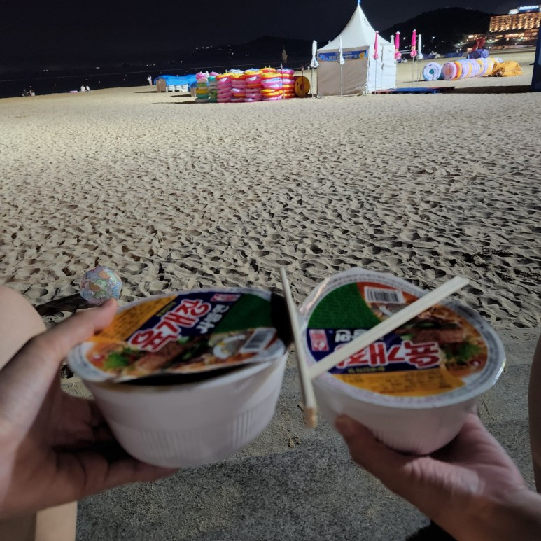 밤바다와 라면. 이튿날 저녁에는 야식으로 라면을 들고 밤바다로 향했다. 시간이 오후 11시 50분쯤이었는데도 사람이 가득했다. 오랜만에 먹는 육개장. 신발을 벗고 밤바다를 걸었다. 밤에 본 바다는 무섭고 고요하다.