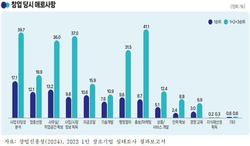 ⓙ 복수 응답한 대표자의 창업시 애로사항에 대한 응답(1+2+3순위)으로 홍보/마케팅 응답이 41.1%로 가장 높게 나타났으며, 사업 타당성 분석 39.7% 사업/시장정보 획득 37.0%, 사무실/작업공간 확보 36.0%, 행정절차 31.5%, 업종선정 19.9%, 자금조달 15.9%, 기술개발 10.9% 등의 순으로 나타났으며, 창업자의 상품개발과 기술개발에 따른 애로사항을 11.6%, 12.2%로 응답하였으나 지식재산권 획득을 위한 애로사항이 0.3%로 파악됨에 따라 해당 센터에서는 창업자의 권리보호 및 안정적인 창업 운영을 위한 지식재산권과 창업 교육 등의 커리큘럼 편성 등이 조금 더 강화될 필요성이 있는 것으로 분석되었다.