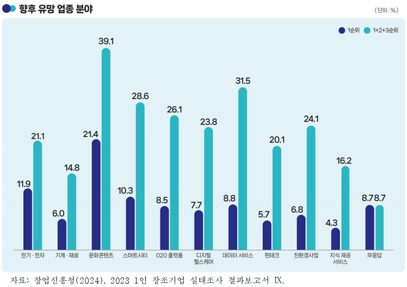 ⓔ 향후 유망한 1인 창조기업 업종분야에 대한 1순위 응답으로는 문화콘텐츠가 21.4%로 가장 높은 응답을 보였으며, 전기전자 11.9%, 스마트시티 10.3% 순으로 나타났다. 앞으로 유망한 1인 창조기업 업종분야에 대한 1에서 3순위까지 응답을 모두 합산하였을 경우 문화콘텐츠가 39.1%로 높은 응답률을 보였으며, 데이터 서비스 31.5%, 스마트시티 28.6%, O2O 플랫폼 26.1% 순으로 나타났다.