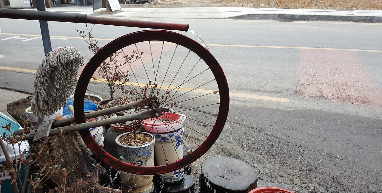 [지금은 사라진 식당 앞에 설치된 자전거 바퀴로 만든 물레방아]