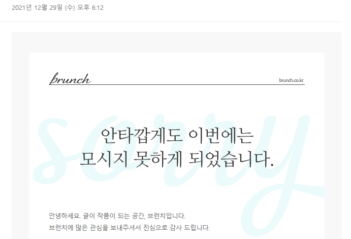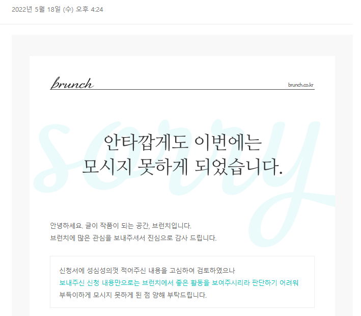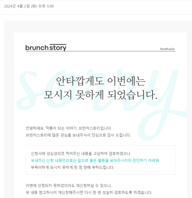 네 번째 도전은 2024년 4월 1일 새벽 1시경에 신청했고, 2024년 4월 2일 화요일 오후 5시 9분에 거절 메일을 받았습니다. 지금까지 브런치 작가 신청 결과 메일을 버리지 않고 보관했습니다. 도전하고 싶은 끌림이 생겼습니다.