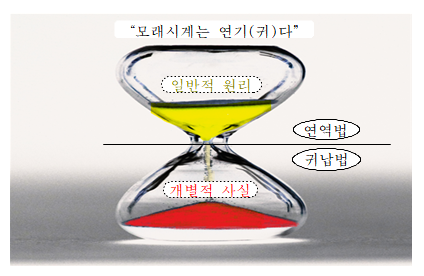 논문을 쓰기 위해 주제를 정하고 논제에 적합한 재료를 가지고 설정한 가설을 과학적 방식으로 추론해야 한다. 쉽게 말해 연역적으로 논제를 제시하고 귀납적으로 결과를 추론하는 것이다. 논문 쓰기를 모래시계에서 찾는다. 글쓰기 과정에서 꼭 명심해야 하는 구조방식이다. 역삼각형 구조는 일반적 원리를 통해 개별적 사실을 주장하는 것이다. 반대로 삼각형 구조는 개별적 사실을 토대로 일반적 원리를 설명하는 방법이다. 앞 장에서 제시한 피라미드 건축 방식에 빗대어 제작 과정 중심으로 본다면 토대를 쌓아 올리는 일반적 원리를 통해 석축을 하나씩 쌓는 방식이지만 실제로 완성된 상태는 개별적 사건을 통해 일반적 원리가 펼쳐진 형태가 된다. 어렵지 않은 개념이지만 설명하려면 헷갈린다. 이를 해결하기 위해 모래시계를 준비했다.
