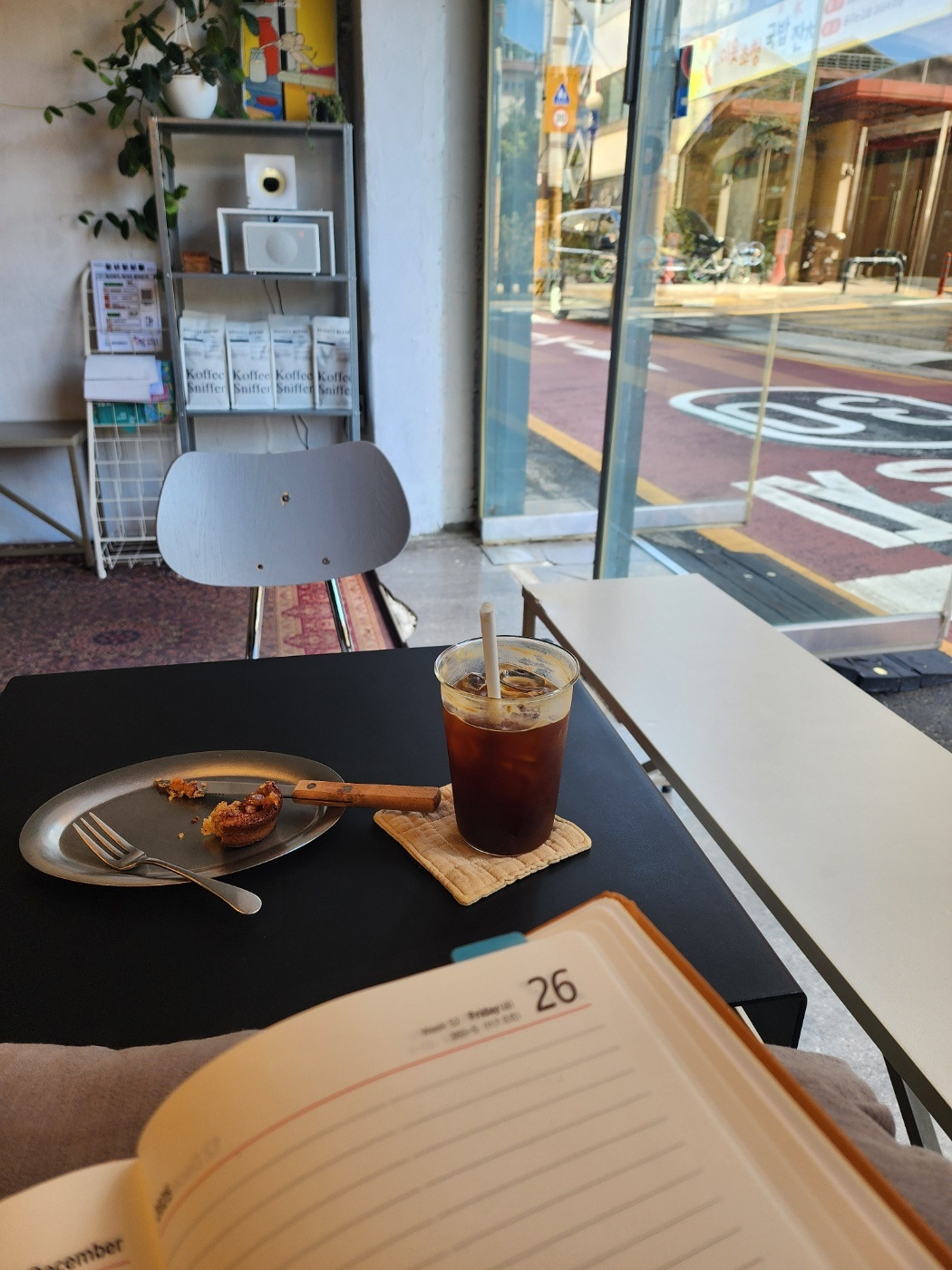 솔직히 맛은 전혀 기대하지 않았다. 커피만 마시려다가 배고파서 하나 시켜본 디저트가 이렇게나 맛이 좋을지는 전혀 상상하지 못했다. 겉은 바삭하면서도 고소했다. 내용물은 달지 않고 사과와 시나몬의 향이 입안에 퍼졌다. 원두를 내리는 커피 향도 너무나 좋았다. 갑자기 모든 게 감사하게 느껴졌다. 오늘 아침에 몸살기운이 있었던 것도, 눈여겨본 카페가 문을 열지 않았던 것도, 날씨가 좋았던 것도, 또 평소 다니지 않던 골목으로 들어갔던 것도 모든 게 다 이곳에 오기 위함이 아니었을까 하는 생각이 들었다. 뜻밖의 일들이 모여 하루가 된다. 계획대로 되지 않았기에 오히려 더 완벽했던 오전이었다. 그렇게 나는 다이어리와 노트를 펼쳐 조용히 시간을 보냈다.