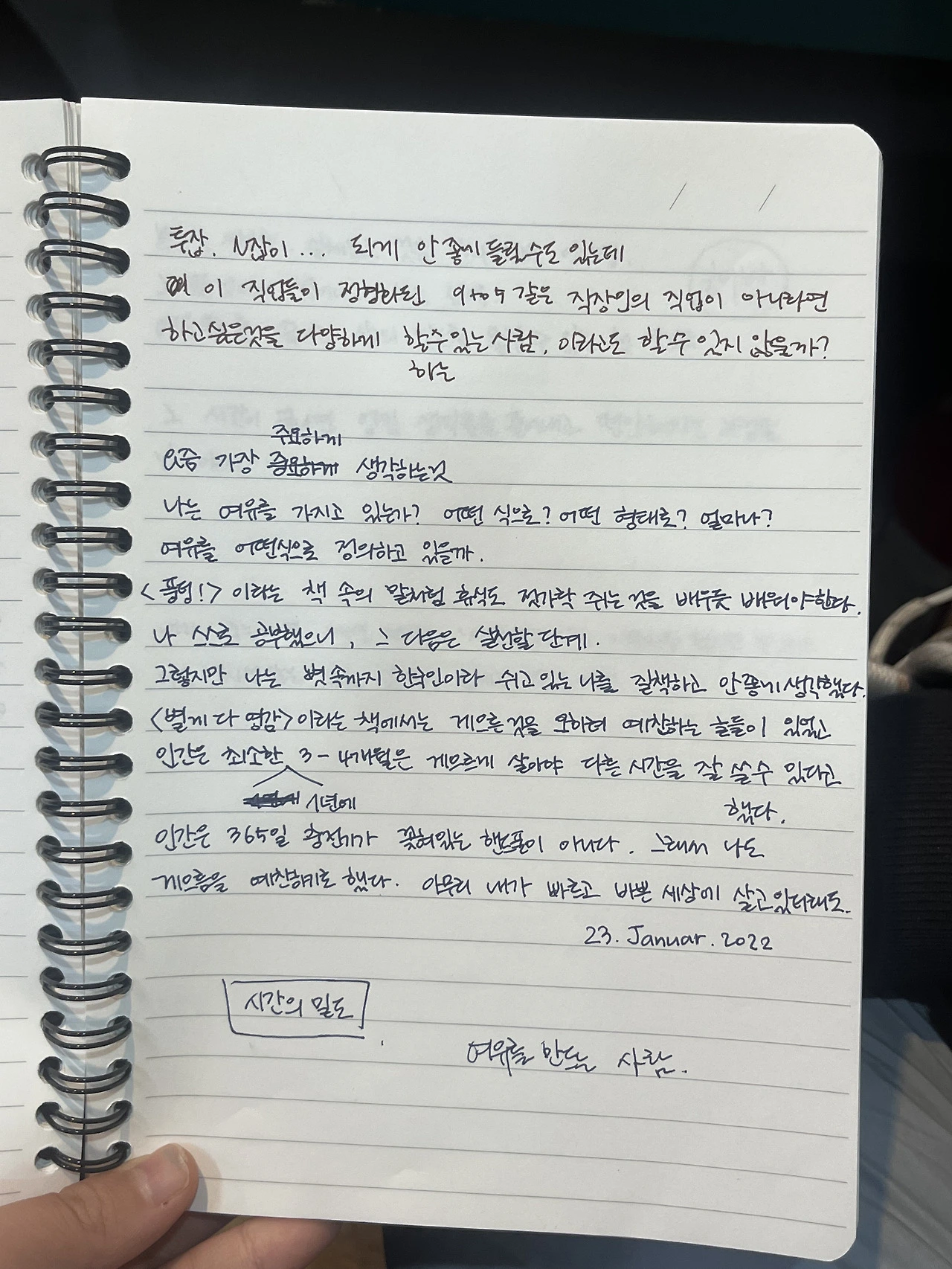 기록을 시작한 건 사실 그저 작업 아이디어를 기록하기 위함이었다. 그런 것들은 또 쉽게 휙 쓸려가기 마련이다. 어딘가에 붙잡아두지 않으면 영영 내 손을 떠나버렸다. 그게 너무 아까워서 하루는 친구와 다이소에 가서 평범한 노트를 한 권 사 왔다.