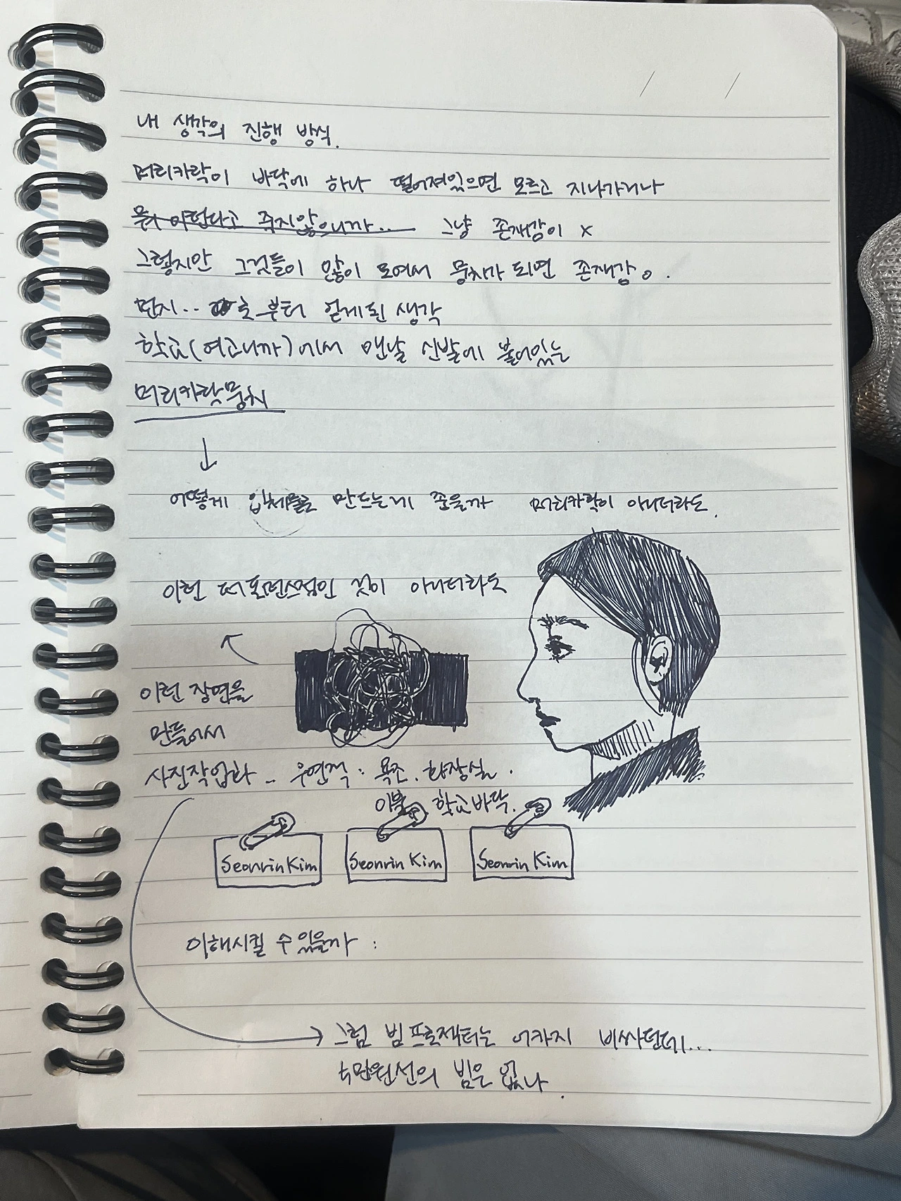 미술 작업이라는 것은 단순히 시각적인 창작활동이 아닌 더 깊은 층위를 포함한다. 어쩌면 미술은 “그린다” 혹은 “만든다”라는 행위보다 “생각한다”가 더 핵심적일 수 있다. 그렇다 보니 작업 아이디어를 모은다는 게, 단순히 그에 대한 추상적인 상상처럼 그저 스케치를 하는 것과는 매우 다르다. 내 생각과 기분 무엇이라도 적으면 작업에 도움이 될까 싶어 닥치는 대로 적었다. 보이는 것, 들리는 것, 생각나는 것, 정말 모두를 적기 시작했다.