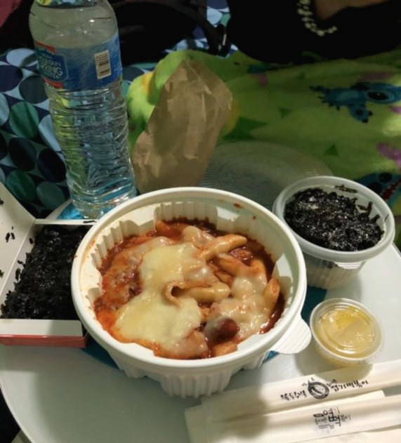 우리는 엽떡에 넓적 당면, 소시지를 추가하고 컵밥과 주먹밥, 튀김 세트를 시켰다. 둘이 먹기엔 푸짐했지만 J는 언제 먹을 수 있을지 모르니 먹고 싶은 건 다 추가하라고 했다. 한국과 같이 플라스틱 뚜껑에 덮여온 엽떡을 보니 너무 반가웠다. 마트에 물을 사러 간 J를 기다리며 세팅하는데 내 나라에서 본 그 모습과 너무 똑같아 괜히 한국 생각이 났다. 미국에서 '동대문 엽기떡볶이'라고 쓰여있는 일회용 젓가락을 뜯게 되다니.