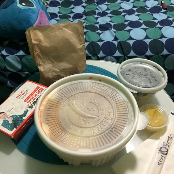 무튼 LA에서 엽떡은 꽤 유명하다. 여행 온 한국인들은 필수코스처럼 엽떡(혹은 북창동 순두부찌개)을 먹고 간다. LA 한인타운은 미국 내에서도 규모가 큰 편이라 특히나 한국 음식들을 쉽게 접할 수 있었다.(어느 날은 J가 명량 핫도그도 사다 줬다.) 그중 엽떡이 유명한 이유는 한국의 맛을 가장 비슷하게 내기 때문이라고 생각하는데, 오히려 한국 엽떡보다 맛있다는 후기에 약간 기대를 했다. 우버 이츠로 주문한 엽떡은 생각보다 빨리 도착했다. 오래 걸릴 줄 알고 마트에 다녀오려고 했는데 도착 10분 전이라는 메시지를 받고 급하게 돌아가야 했다.