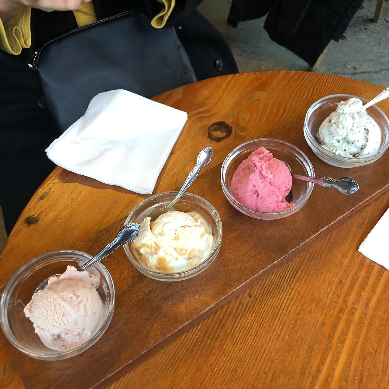 나는 민트 초코와 스트로베리 코코넛, J는 솔티캐러멜과 후추가 들어간 발사믹 딸기(strawberry honey balsamic with black pepper). 우리는 빈 테이블에 앉아 맛 평가의 시간을 가졌다. 이곳의 아이스크림은 맛이 모두 강렬했다. 솔티캐러멜은 정말 캐러멜에 소금을 뿌린 맛이 났고, 스트로베리 코코넛은 딸기 셔벗 맛이 나다가 끝에 코코넛 향이 돌았다. 민트 초코는 밀도 높은 민트맛이 돌았으며 발사믹 딸기는 매운맛이 났다.