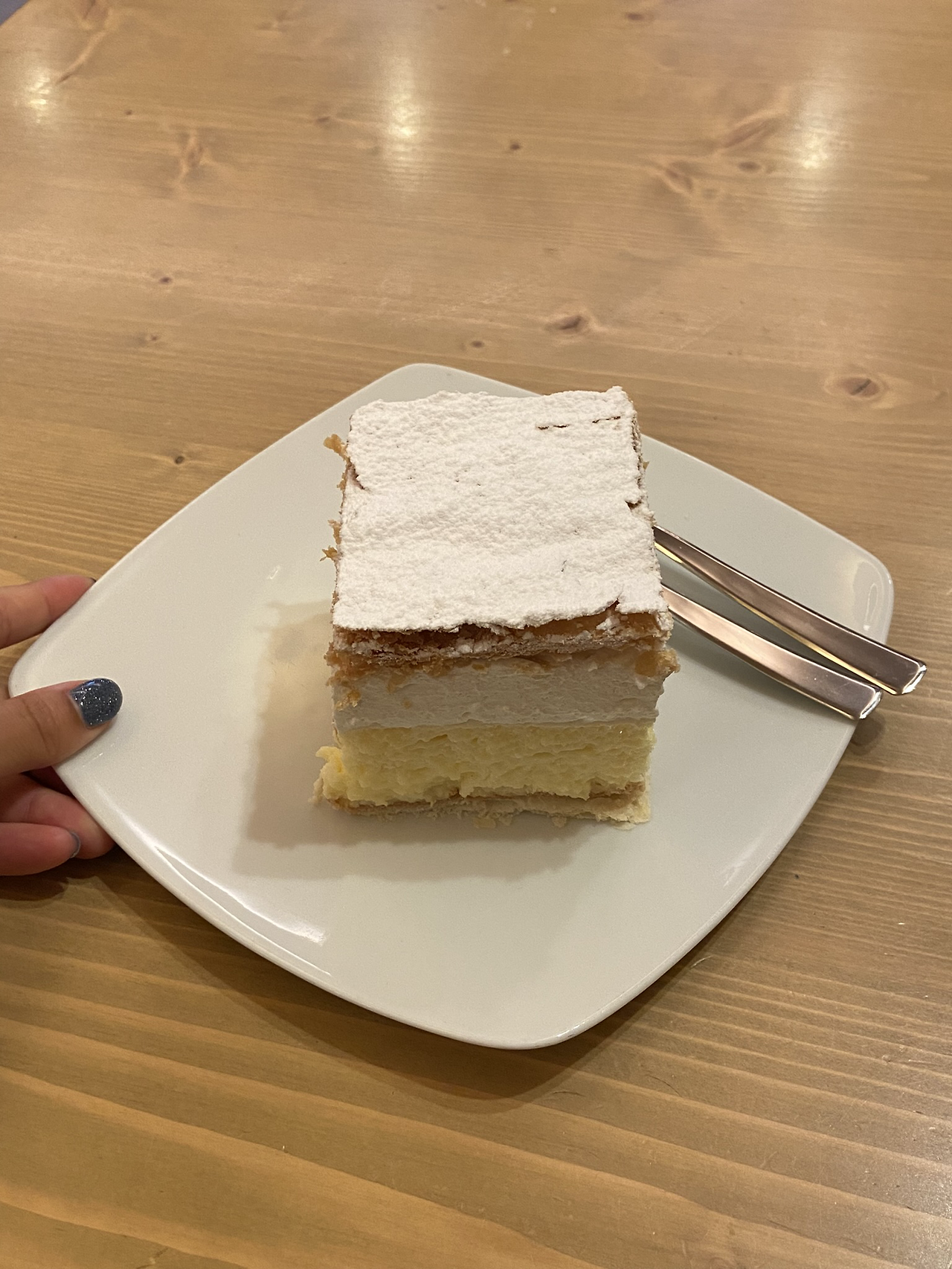 어쩌면 이게 슬로베니아에서 먹은 유일한 빵일지도 모르겠어요. 블래드 근처 카페에서 먹은 것인데요. 크렘 레지나라는 케이크입니다. 위아래로 누네띠네 같은 얇은 패스트리가 덮여있고 안에는 두 층의 크림이 있어요. 커스터드와 생크림 같았어요. 빵은 없고 크림만 있어서 조금 당황했지만 별로 느끼하지는 않았어요. 많은 사람들이 이 케이크를 먹으러 온다고 들었습니다. 비가 와서 추운 블래드 호수를 등지고 이 케이크를 먹은 후에 숙소로 돌아왔어요. 돌아오면서는 비빔밥을 포장해 가자는 야무진 계획을 세웠고요. 사실은 조금 느끼했던 걸까요. 모든 건 비빔밥을 먹기 위한 빌드업일 뿐이었을지도 몰라요.