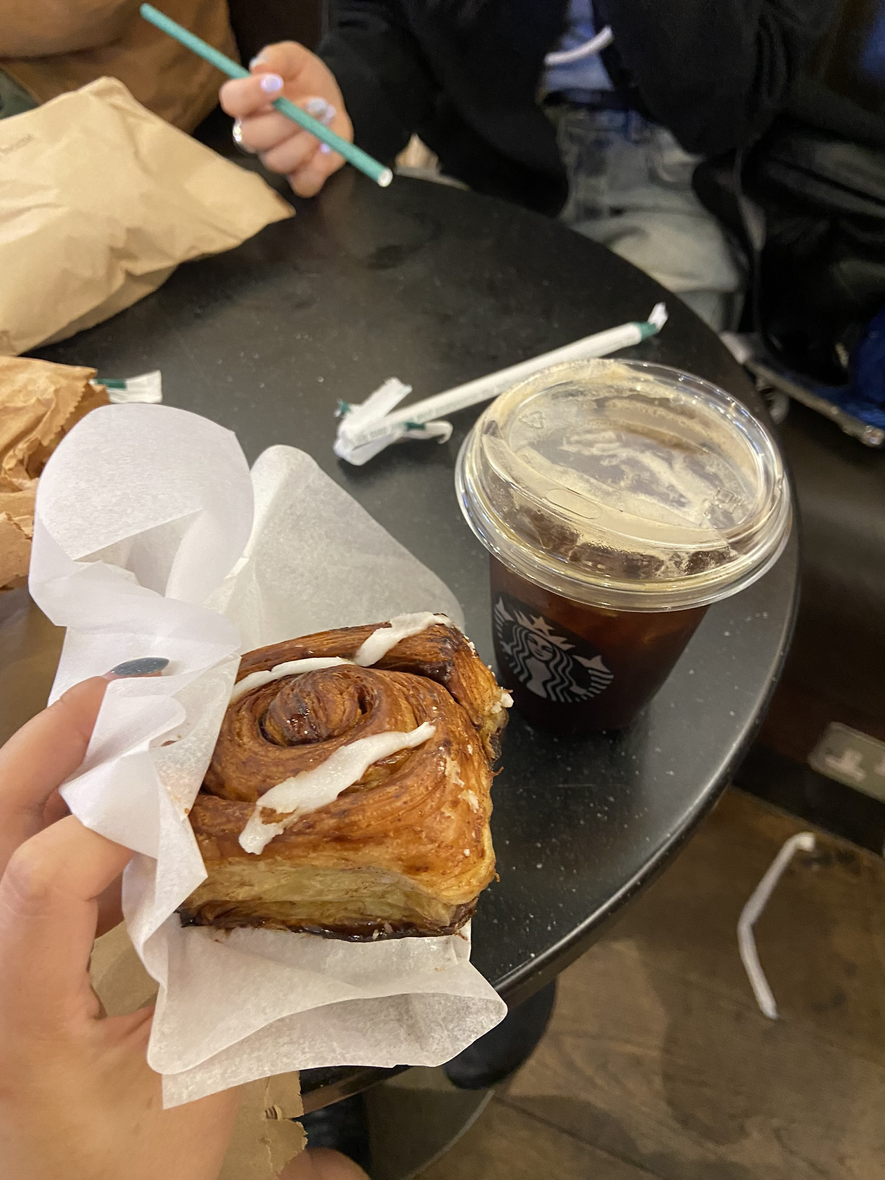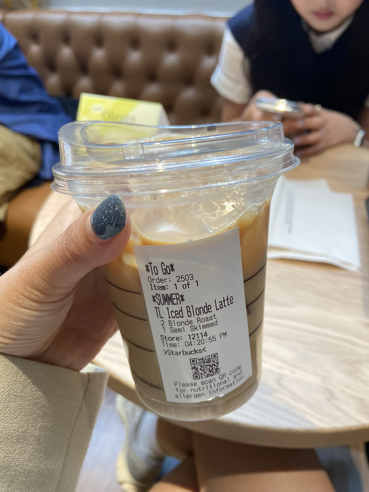 저분들과는 잠시 이야기를 하고 악수까지 했는데요. 말을 정말 잘하고 사람을 좋아하는 것 같더라고요. 저희는 쉬려고 왔는데, 더 지친 나머지 곧 입을 다물게 됐어요. 아마 제 에너지를 그들이 빨아들인 것 같아요. 샘플링한 신메뉴는 올리브오일이 들어간 음료인데요. 되게 향긋하고 건강한 맛이었어요. 하지만 저는 솔티드 크림 콜드브루를 먹어야 해서요. 그리고 저희는 올리브오일이 그렇게 친숙하지 않잖아요. 채소 볶을 때 쓰던 걸 커피에 섞어 먹으니까 신세계였지만 저는 그냥 구세계에 머물고 싶은 마음입니다.