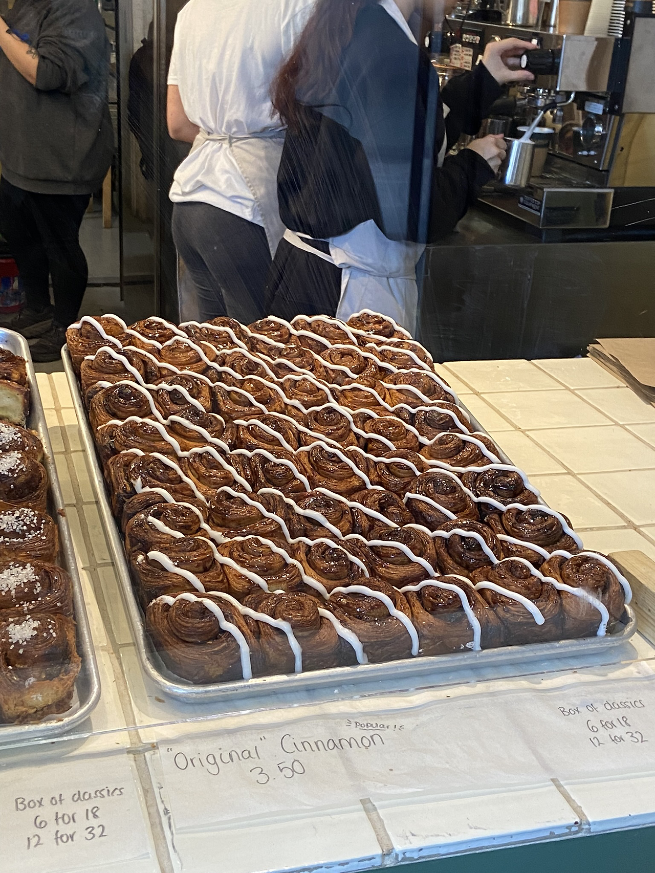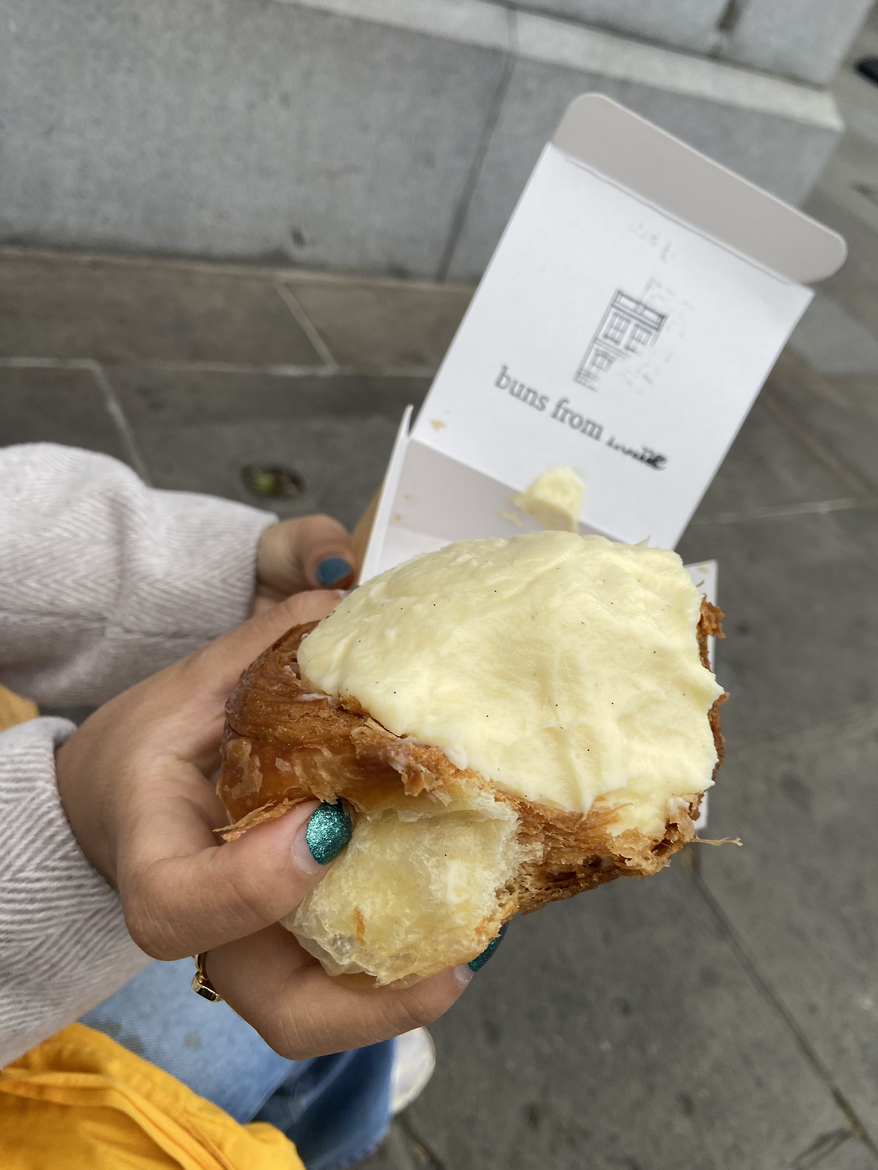 시나몬 빵은 정말 후회가 없었습니다. 가능하다면 한 번에 세 개씩 먹고 싶은 맛이었는데요. 그래서 마지막 날에도 가기로 했습니다. 사실 시나몬 빵보다 이 크림빵이 더 유명하다고 하더라고요. 비주얼이 말도 안 돼서 설레는 마음으로 구매했습니다. 크림이 바닥까지 꽉 차있어서 상자에 한번 털고 먹었습니다. 묵직-하게 떨어졌어요. 아까운 크림을 버릴 수는 없으니까 시나몬 빵에 찍어 먹었는데요. 지금 생각해 보니 이렇게 먹다가 살찐 것 같아요.