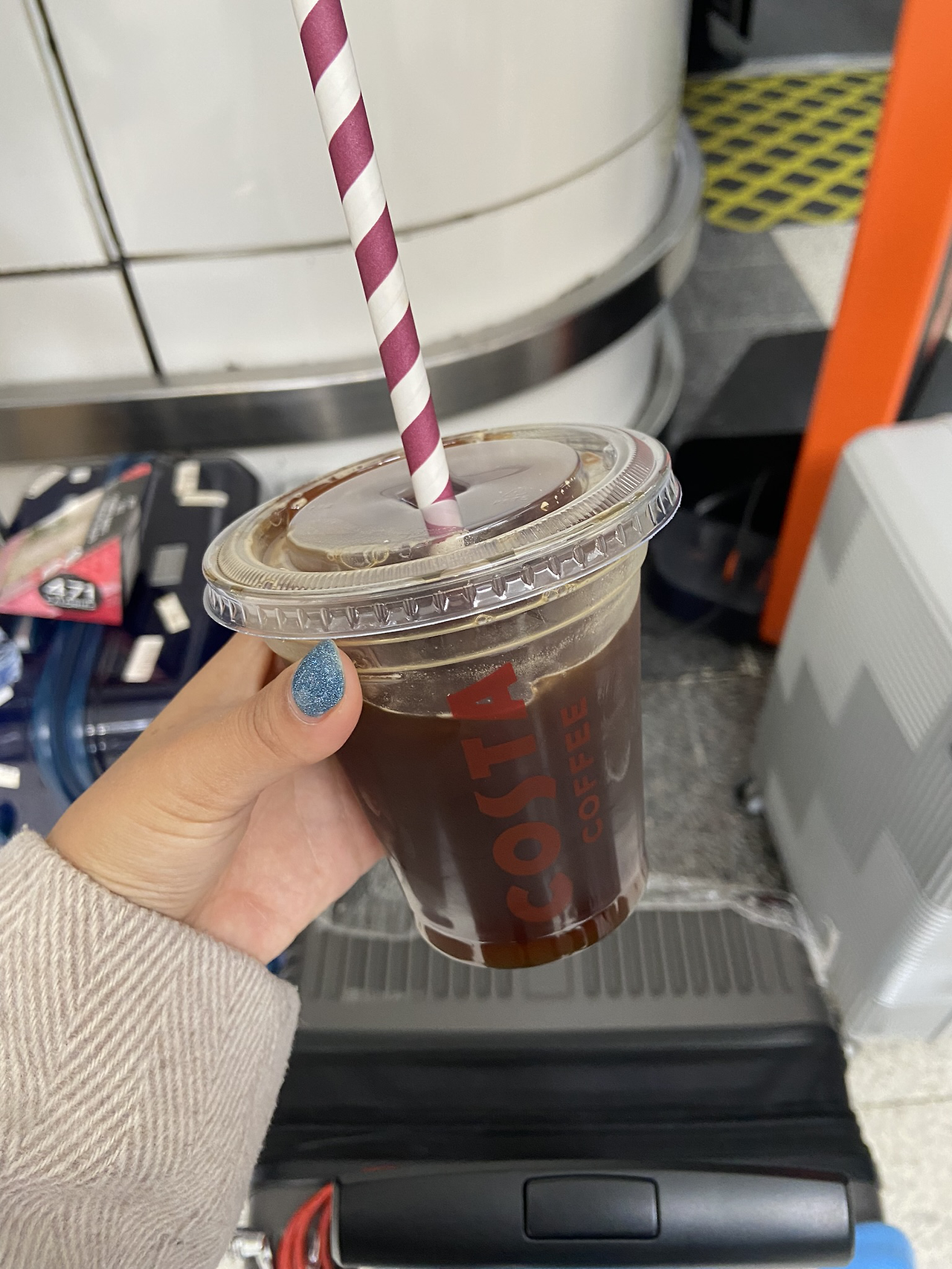 런던 근교 캠브리지로 떠나는 길입니다. 1박을 위해 세 달 치 짐을 바리바리 싸들고 가는 저희의 계획을 잠시 원망했어요. 심지어 한 명은 곧 바르셀로나로 떠나야 해서 당일치기로 캠브리지를 찍고 갔거든요. 다시 런던에 온다면 이런 일정은 없을 거라고 생각하며 캠브리지로 향했어요. 모닝커피로는 예전에 한번 마셔보고 다시는 먹지 않겠다고 다짐했던 코스타 커피를 한잔 했습니다. 너무 더워서 아이스커피가 간절했는데, 그렇게 많던 아이스 음료가 기차역에는 하나도 없었기 때문이에요.