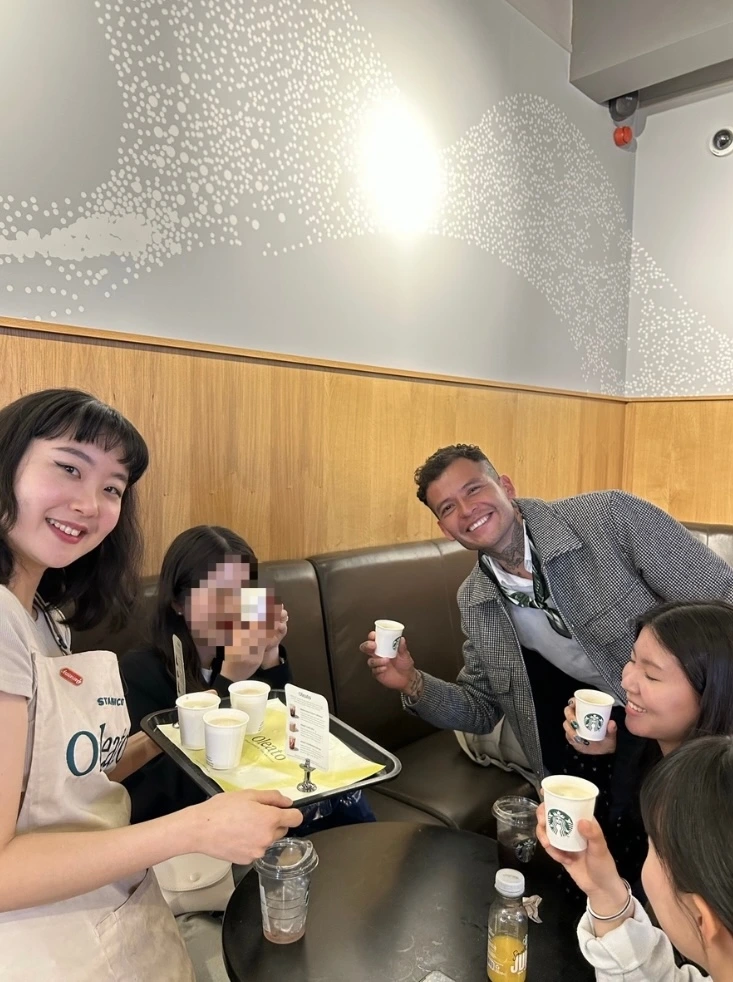 저희가 갔던 스타벅스 중에 사람이 가장 많았던 매장입니다. 런던 소호 거리 한복판에 있는 곳인데요. 차이나타운과 가까워서 유동 인구도 굉장히 많은 것 같았어요. 대도시의 위엄에 눌린 나머지, 잠시 쉬고 싶어서 카페를 찾아다니던 차였습니다. 근처 스타벅스는 모두 자리가 없어서 세 번째 시도에 겨우 앉을 곳을 찾아냈어요. 이 스타벅스에는 유난히 특별한 기억이 있는데요. 저희 주문을 받은 바리스타가 한국인이었기 때문입니다. 그리고 그녀가 샘플링을 진행할 때 찍힌 사진이 있는데요. 옆자리에 앉은 콜롬비아인이 함께 사진을 찍겠다고 했어요.