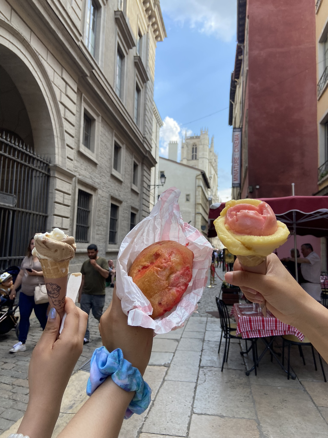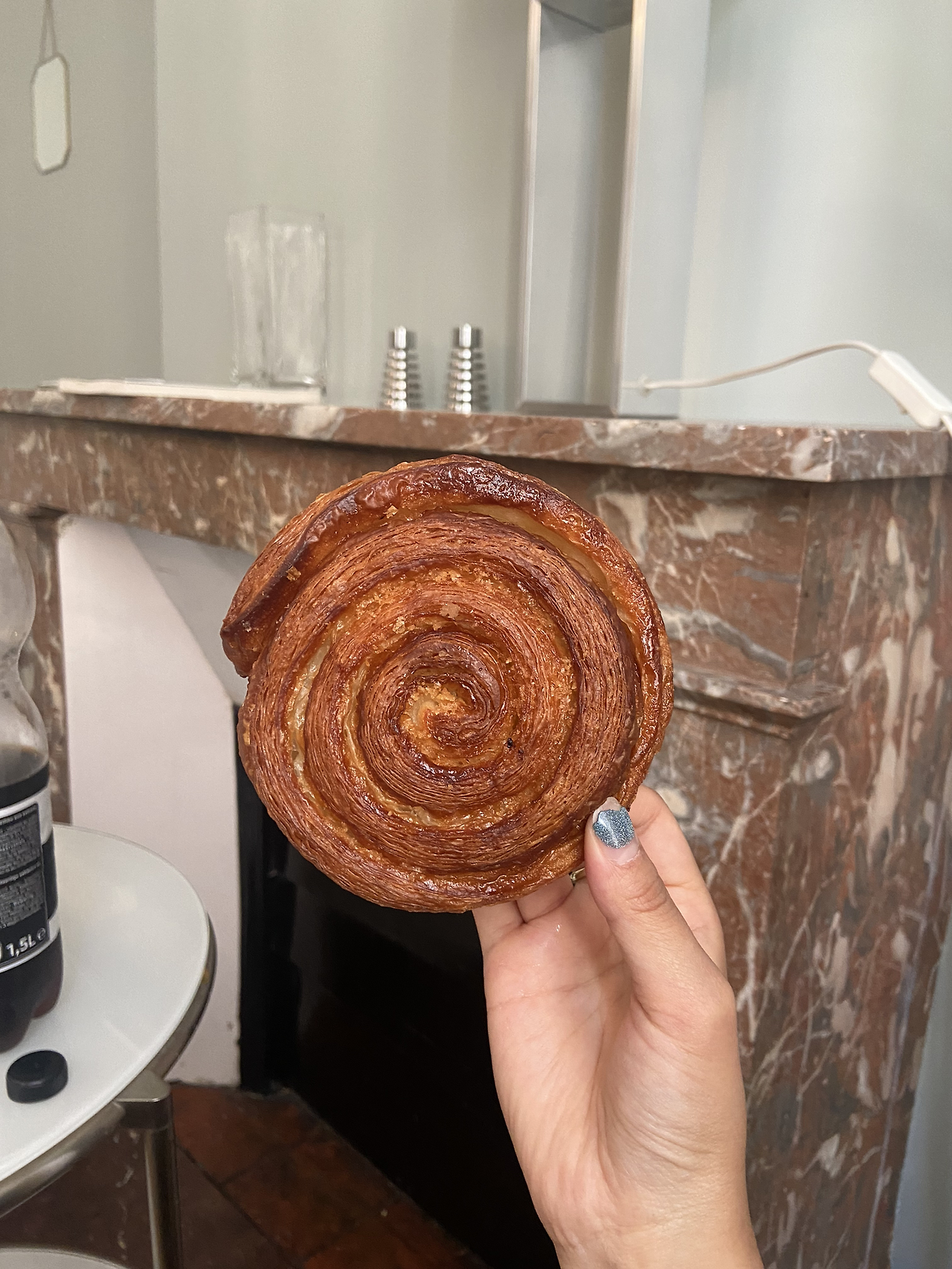이게 정말 신기했는데요. 가게 밖에서 보고 왜 이렇게 빨간 게 자꾸 눈에 보이지, 했는데 모두 빵이었던 거예요. 리옹 전통 빵이라는 것 같아요. 이름은 정확히 모르겠지만 아주 부드러운 빵 안에 핑크색 설탕 코팅 같은 게 되어있고, 견과류가 크게 씹혀요. 아몬드 크로와상 결에 밴 단맛 같달까요. 견과류가 박혀있는 것도 너무 좋았어요. 정말 처음 먹어보는 빵, 처음 느껴보는 맛이라서 모든 게 생경했던 기억이 납니다.