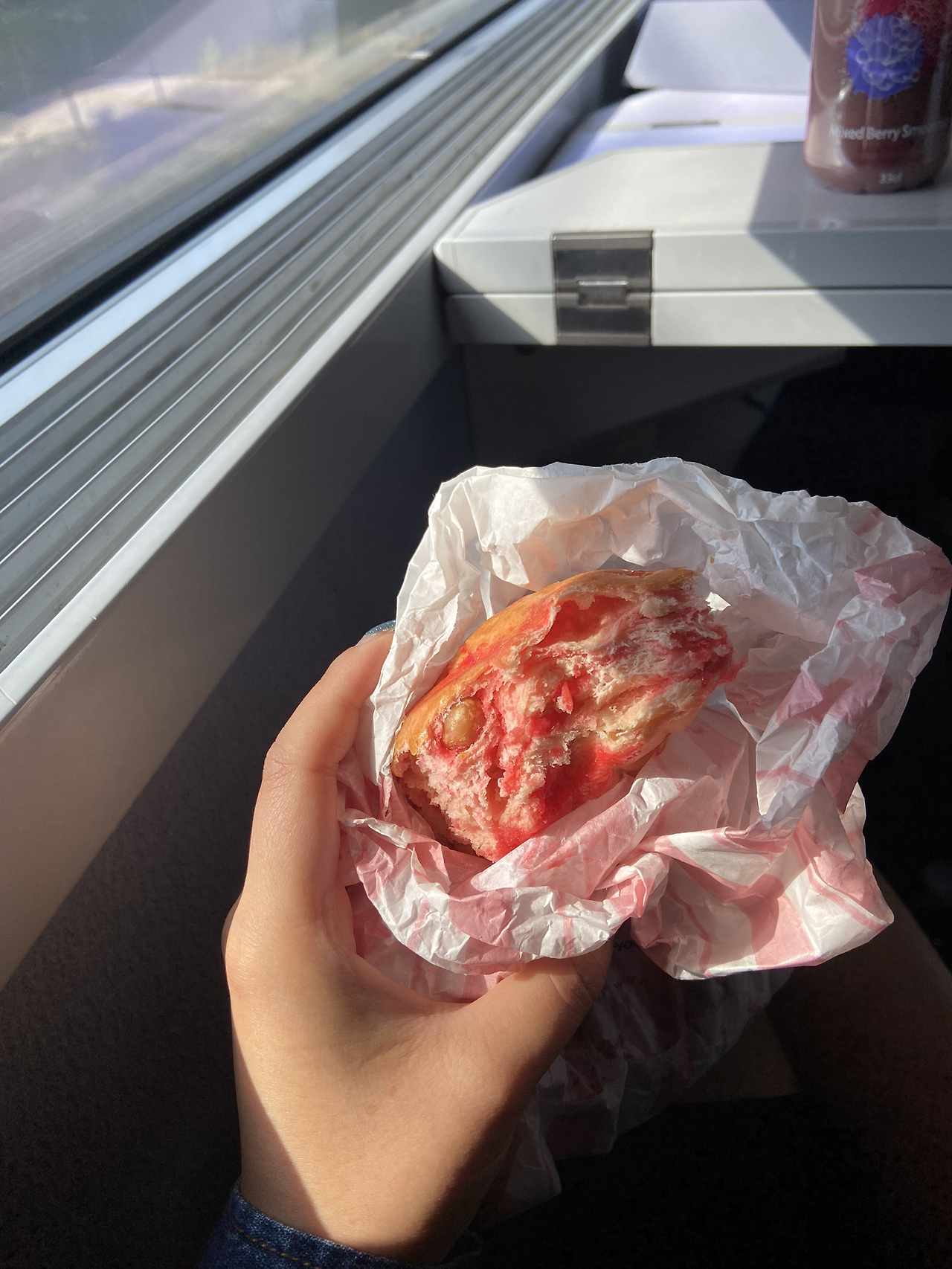 거의 처음으로 플랫화이트가 아닌 라떼를 먹었던 것 같은데요. 그런데 첫 입 먹고 바로 후회했어요. 너무 셔서요…… 라떼가 셔서 눈을 찌푸릴 정도면 대체 그냥 샷은 얼마나 신 걸까요. 라떼 사이즈가 커서 후회한 건 처음이었던 것 같아요. 항상 모자라서 후회했지, 많아서 후회하지는 않았거든요. 한 절반 정도 먹고 보니까 그래도 좀 익숙해지더라구요. 맛있다는 생각도 가끔 했던 것 같아요. 그래도 산미 있는 커피를 싫어하지는 않는데, 이 날은 조금 싫어질 뻔하긴 했어요. 그래도 집 앞에 앉아서 혼자 모닝커피의 여유를 즐길 수 있었습니다.